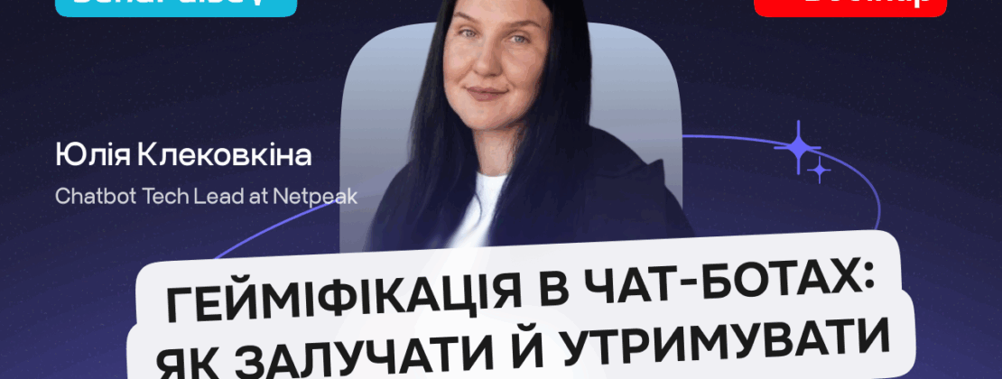 Спікер вебінару — Юлія Клековкіна, Chatbot Tech Lead at Netpeak, поділилася досвідом та практичними кейсами, як перетворити звичайну комунікацію з користувачем у захопливу гру, що приносить бізнесу реальні результати.