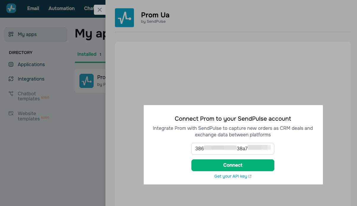 Перейдіть до Мої застосунки (My apps) > Встановлені (Installed) та виберіть Prom Ua. У полі введення додайте токен із Prom та натисніть Підключити (Connect).