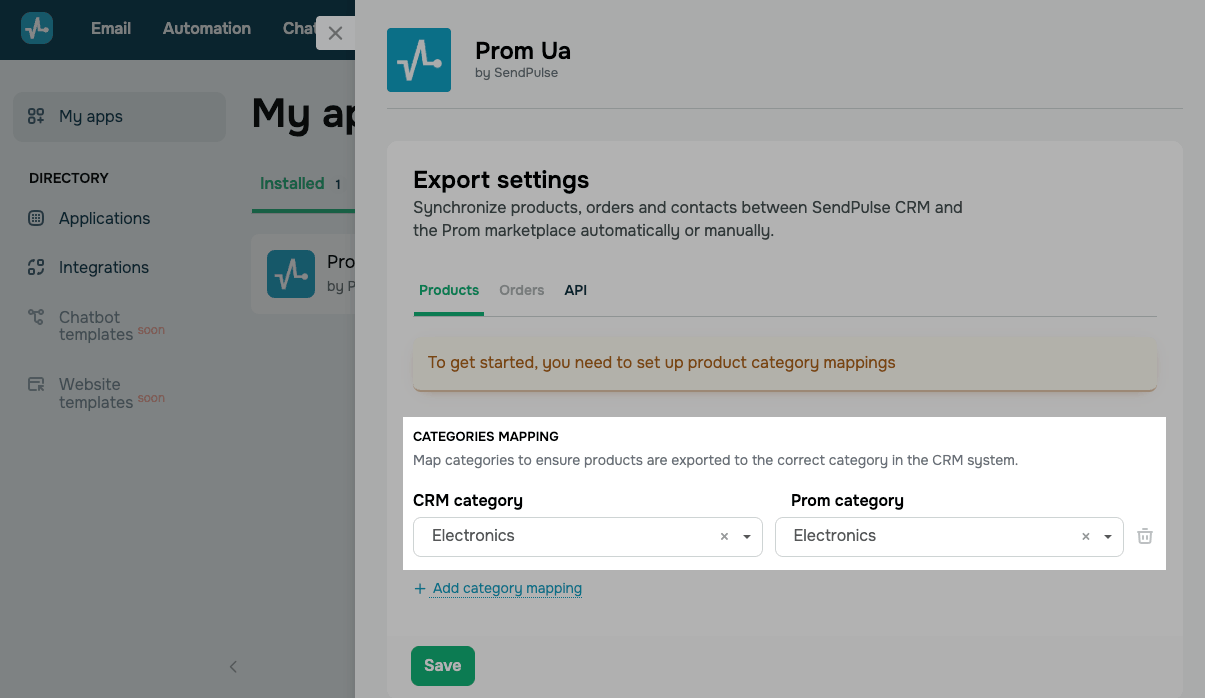 Налаштуйте відповідність категорій між магазином на Prom і SendPulse CRM, щоб передавати товари в потрібні категорії.