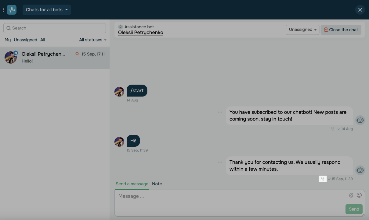 Наприклад, якщо користувач скаржиться, що бот не відповів на його питання, менеджер може переглянути історію чату, побачити, на які дії була реакція, чи спрацювали всі ланцюжки, чи є реакції на повідомлення, а також чи втручався хтось інший із команди.
