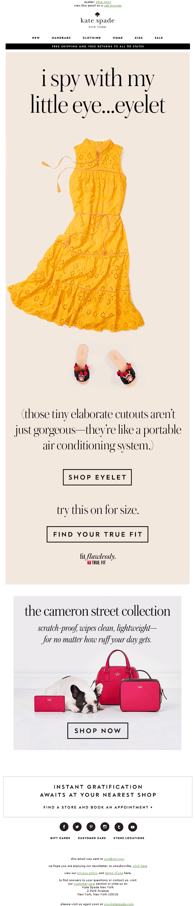 Копирайтеры Kate Spade в заголовке обыграли строчку из хита Робби Уильямса «Love Supreme» — «I spy with my little eye..eyelet». Эта игра слов связана с названием типа ткани, из которого сшито платье на картинке. Eylet — легкая ткань в дырочку. Если перевести, получается: «Я подглядываю через…дырочки платья». В комбинации с фирменным шрифтом и GIF письмо играет.