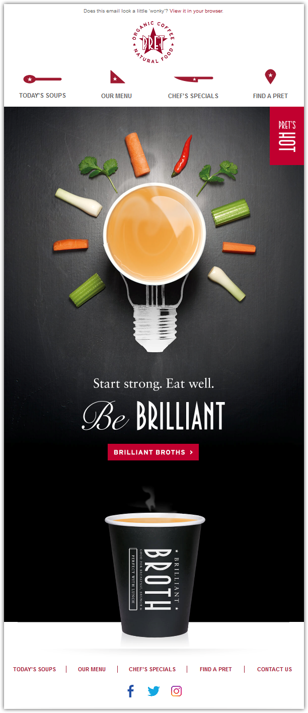 Лаконичный заголовок, обрамленный оригинальным дизайном, в рассылке от Pret, интернет-магазина натуральной еды и органического кофе. В письме рекламируют бульоны с акцентом на то, что бодрое утро начинается именно с бульона: «Начинай мощно. Питайся хорошо. Будь неотразим».