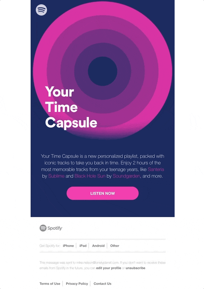 Spotify предлагают своим пользователям «Капсулу времени» — двухчасовой плейлист с треками, которые вы любили слушать. Немного магии с GIF, лаконичный заголовок, CTA и капсула готова унести вас в прошлое.