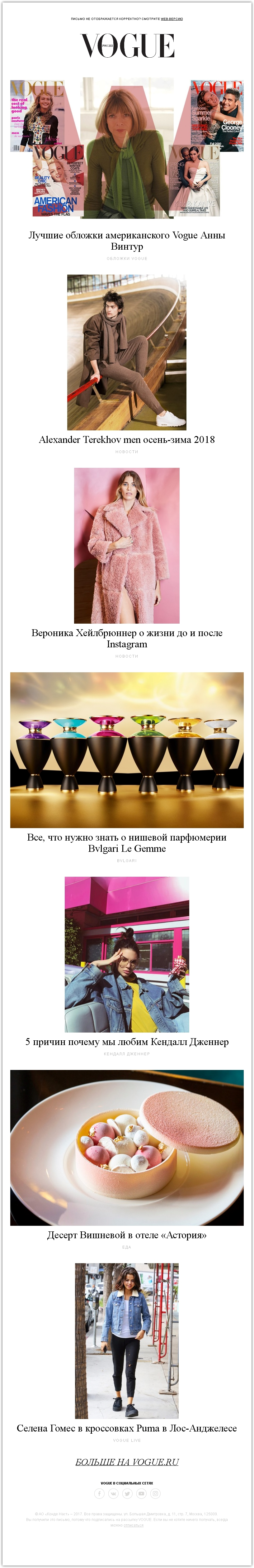 Журнал Vogue Россия прислал дайджест, в котором только фото и заголовки, даже без лидов. Если у вас фотографии такого профессионального уровня, как у Vogue — смело пользуйтесь этим.
