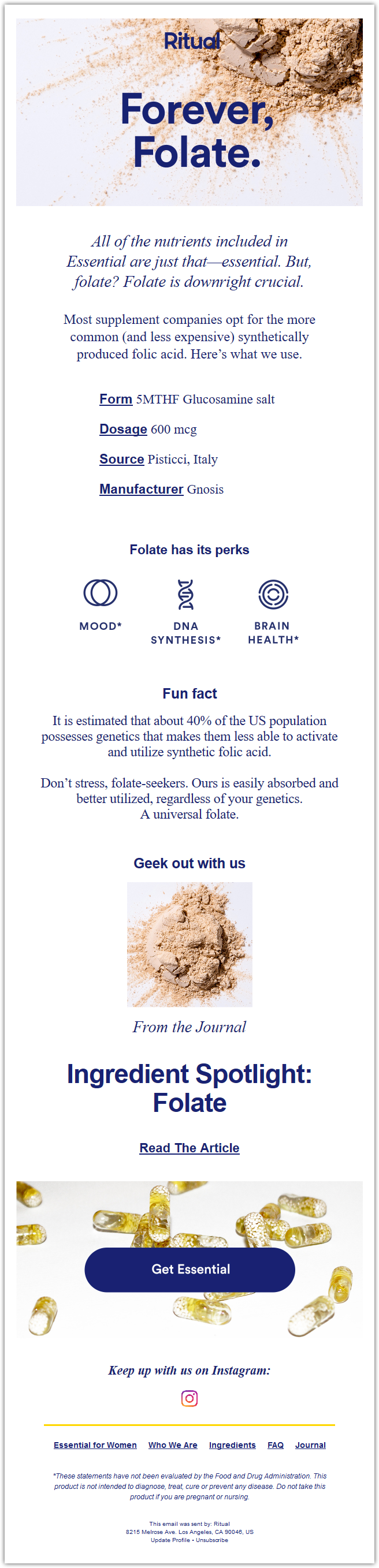 Ritual, онлайн-магазин витаминов не просто продвигает свои товары, но и рассказывает читателям полезные факты о них. Этот выпуск посвящен фолиевой кислоте — ее свойствам, на что она влияет в организме и какие виды кислоты хорошо усваиваются.