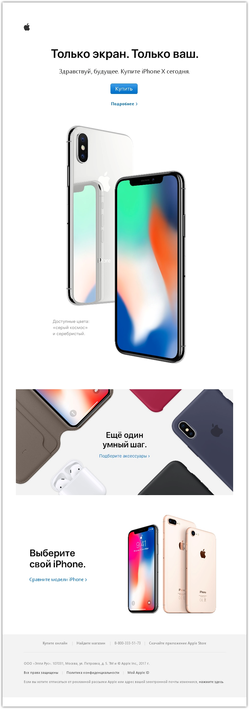 Помимо функционала, Apple любят за эстетически привлекательный дизайн. А что лучше опишет красоту дизайна, чем его визуальное представление? В своем письме с рекламой нового IPhone Apple показывают красоту телефона — подчеркивается зеркальность задней панели и геометрия форм. Визуальная часть подкреплена сильным заголовком «Только экран. Только ваш» — краткие предложения с повторением слов цепляют и запоминаются.