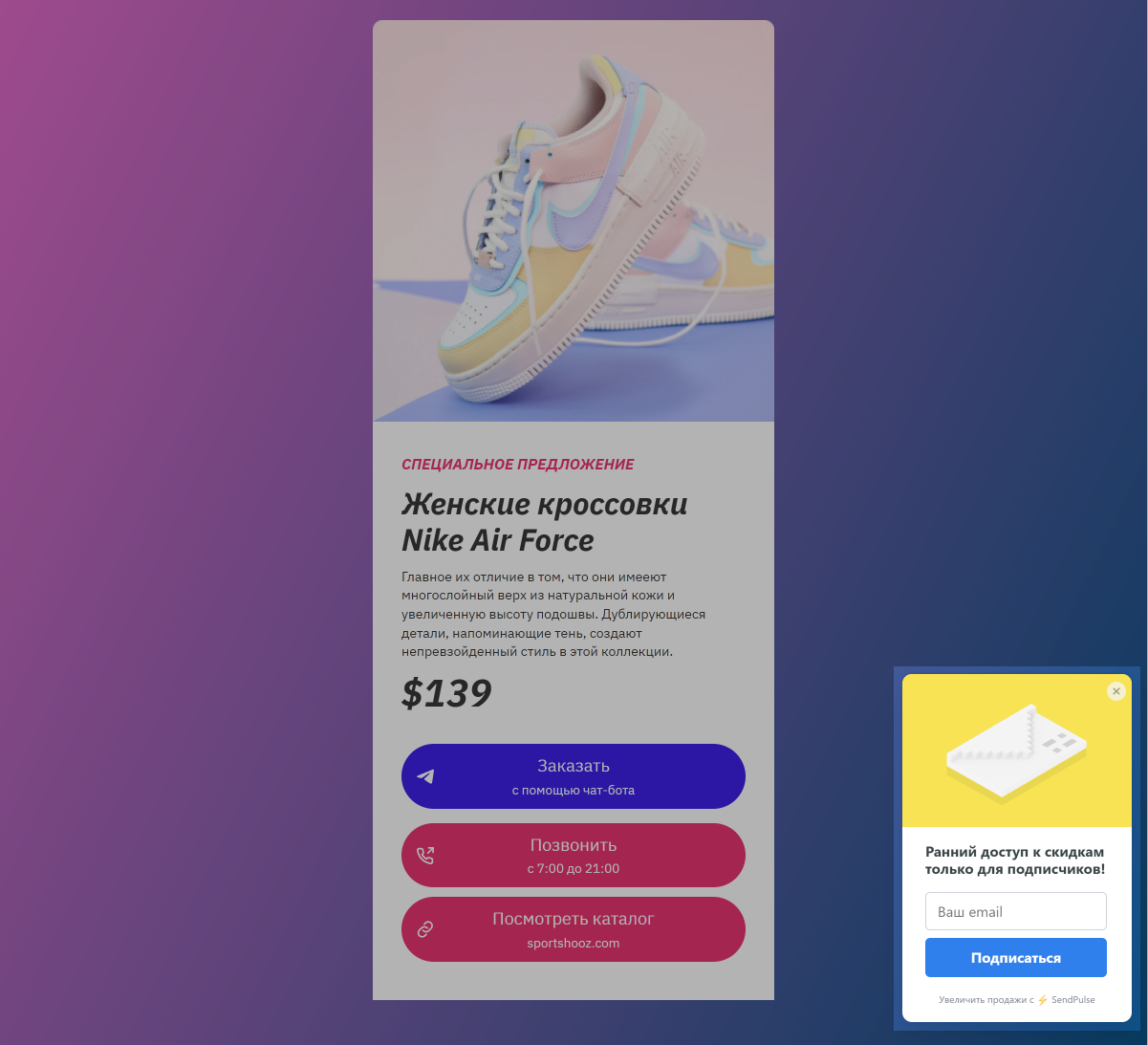 Для сбора данных рекомендуем попробовать формы подписки SendPulse и наш сервис умных попапов по сценариям. Этот инструмент позволит делать персональные предложения в подходящее время, помогать клиентам с выбором товара или услуги и собирать подписчиков для дальнейшей работы в SendPulse. Также у нас есть бесплатная CRM, чат-боты для мессенджеров, сервисы email, SMS и Viber рассылок, конструктор сайтов, push уведомления и платформа для запуска онлайн-курсов. Создавайте контент и продукт, а рутину возьмет на себя SendPulse.