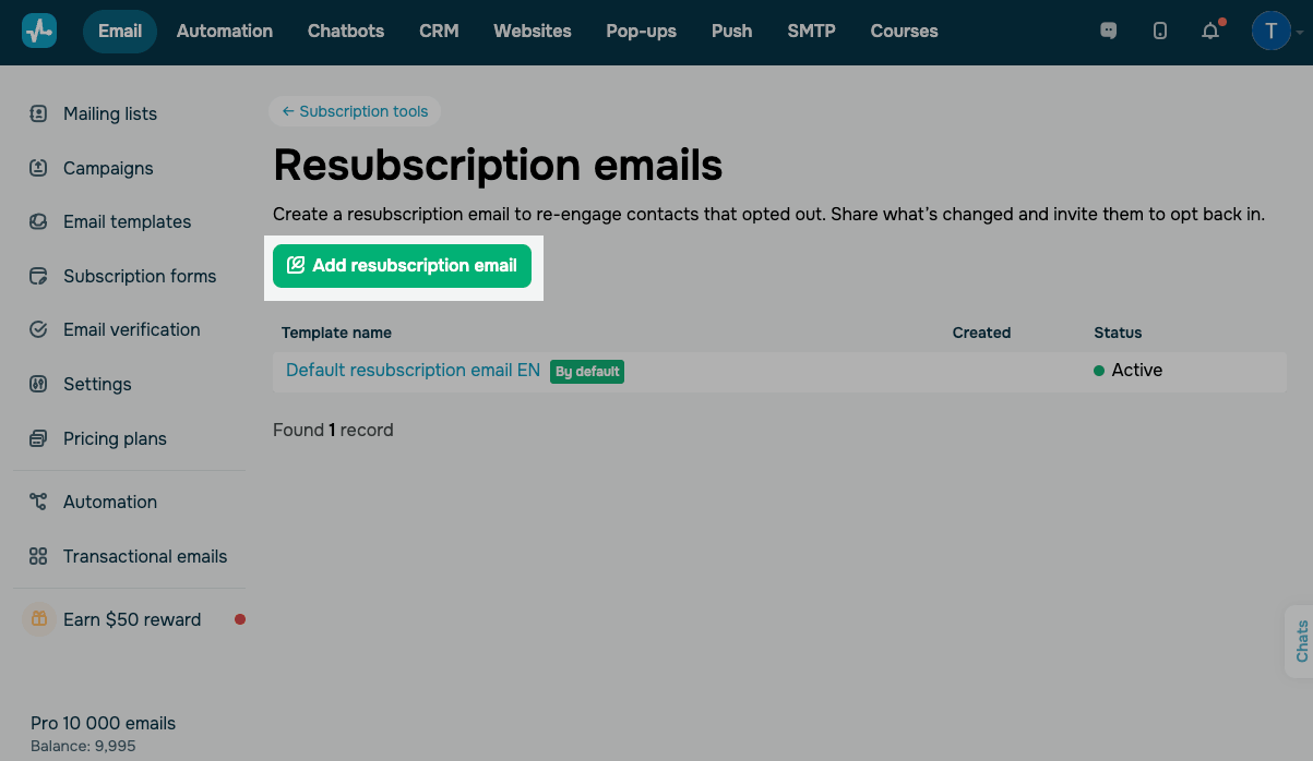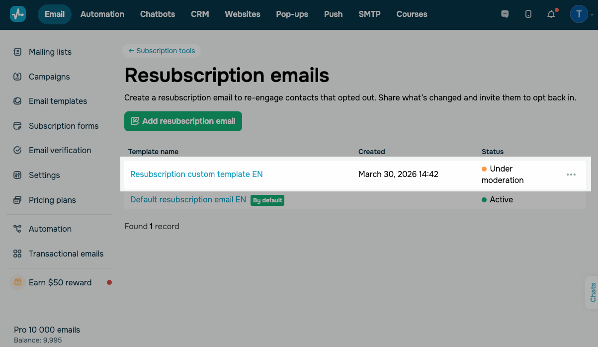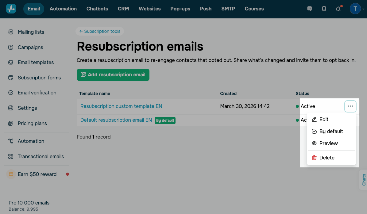 После создания шаблона вы можете управлять им на странице Письма переподписки (Resubscription emails). На странице отображаются все шаблоны с названиями, датами создания и статусами.
