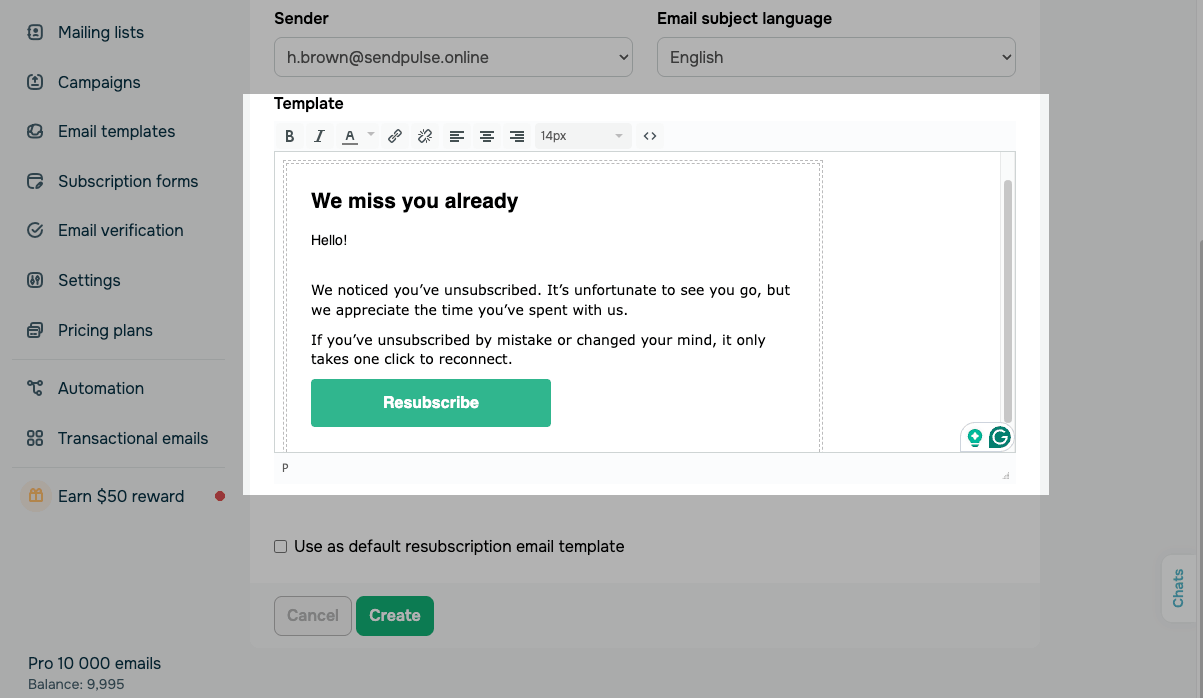 Вы можете воспользоваться шаблоном SendPulse или создать письмо переподписки с нуля.
