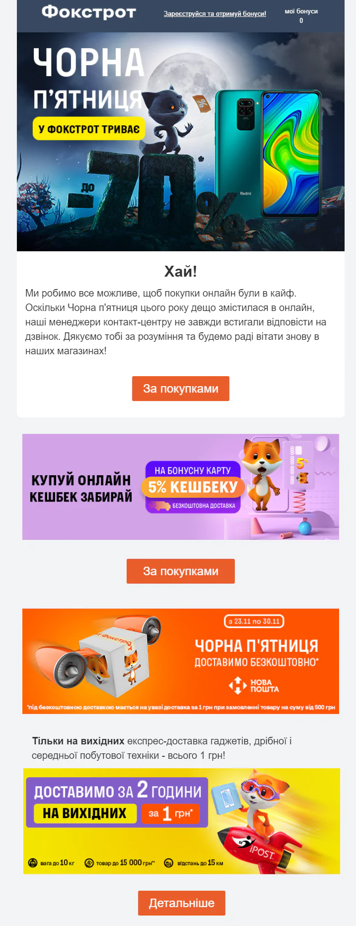 Магазин бытовой техники «Фокстрот» использовал Черную пятницу как повод для email рассылки, в которой делится эксклюзивными предложениями.