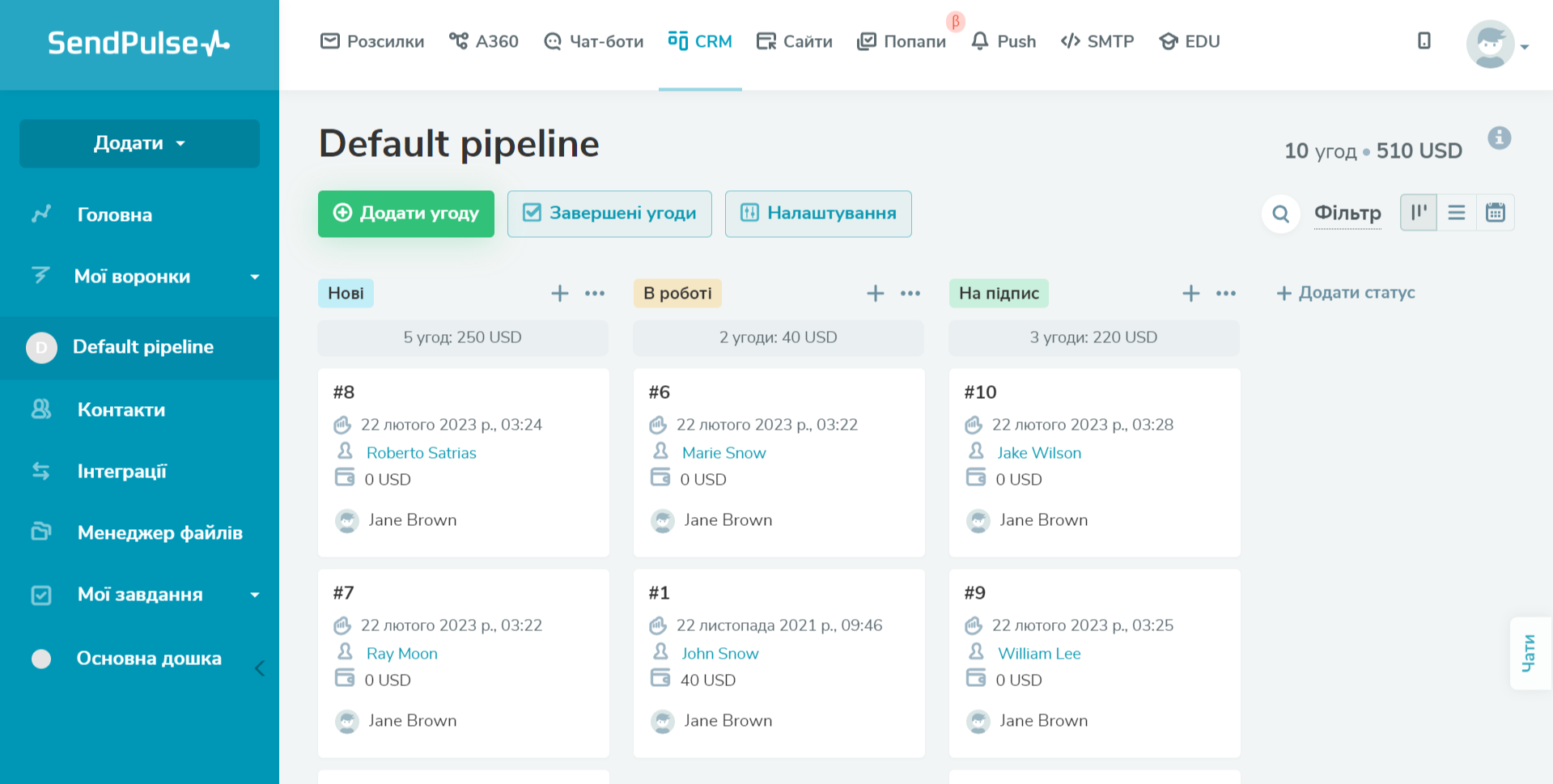 SendPulse пропонує безкоштовну CRM для автоматизації продажу та налагодження взаємин з покупцями. За допомогою нашої системи ви можете приймати замовлення з різних джерел, контролювати прогрес угод за допомогою статусів, візуалізувати їх кількість на канбан-дошці, збирати дані про клієнтів, зберігати інформацію про історію їх покупок, призначати відповідального за кожну угоду та надсилати повідомлення клієнтам через email і чат-боти, щоб наблизити їх до покупки. Все це можна зробити на одній платформі через найзручніші для вашої цільової аудиторії канали зв'язку.