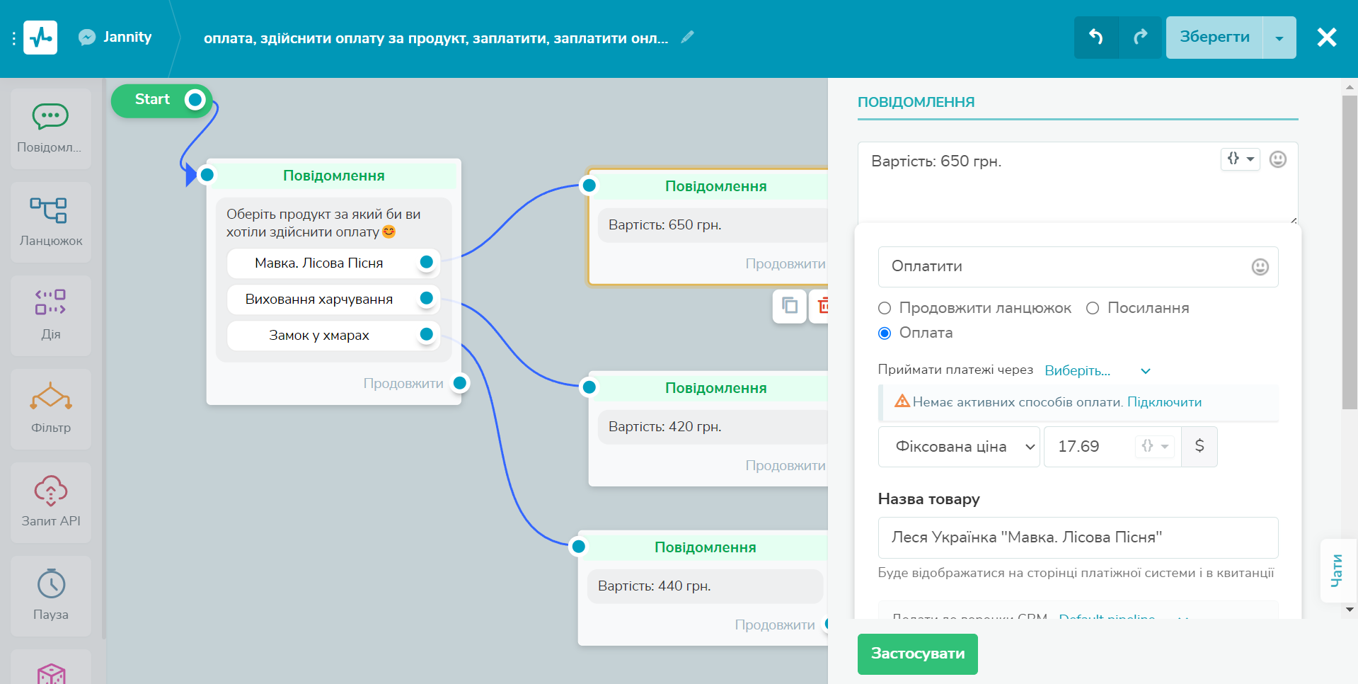 Ви можете використовувати чат-бота для різних цілей. Багато брендів вже автоматизують отримання оплати за допомогою бота. В результаті, він стає ефективним каналом для приймання замовлень та отримання коштів за них. Все, що вам потрібно зробити, це знайти платформу, яка інтегрується з необхідними вам платіжними системами, зареєструватися та налаштувати інтеграцію. Не забудьте додати кнопки оплати, щоб клієнти змогли швидко замовити необхідні товари через ваш чат-бот. Якщо вам потрібні платіжні системи такі як PayPal, Stripe, Fondy, LiqPay, ви можете створити акаунт у SendPulse і відчути переваги нашого сервісу.