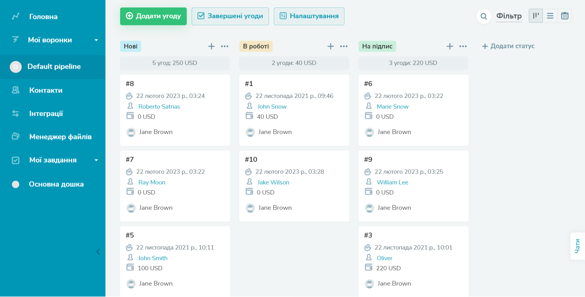 Подивіться, як виглядає канбан-дошка з угодами нашої CRM. Вони розміщені в залежності від статусу.