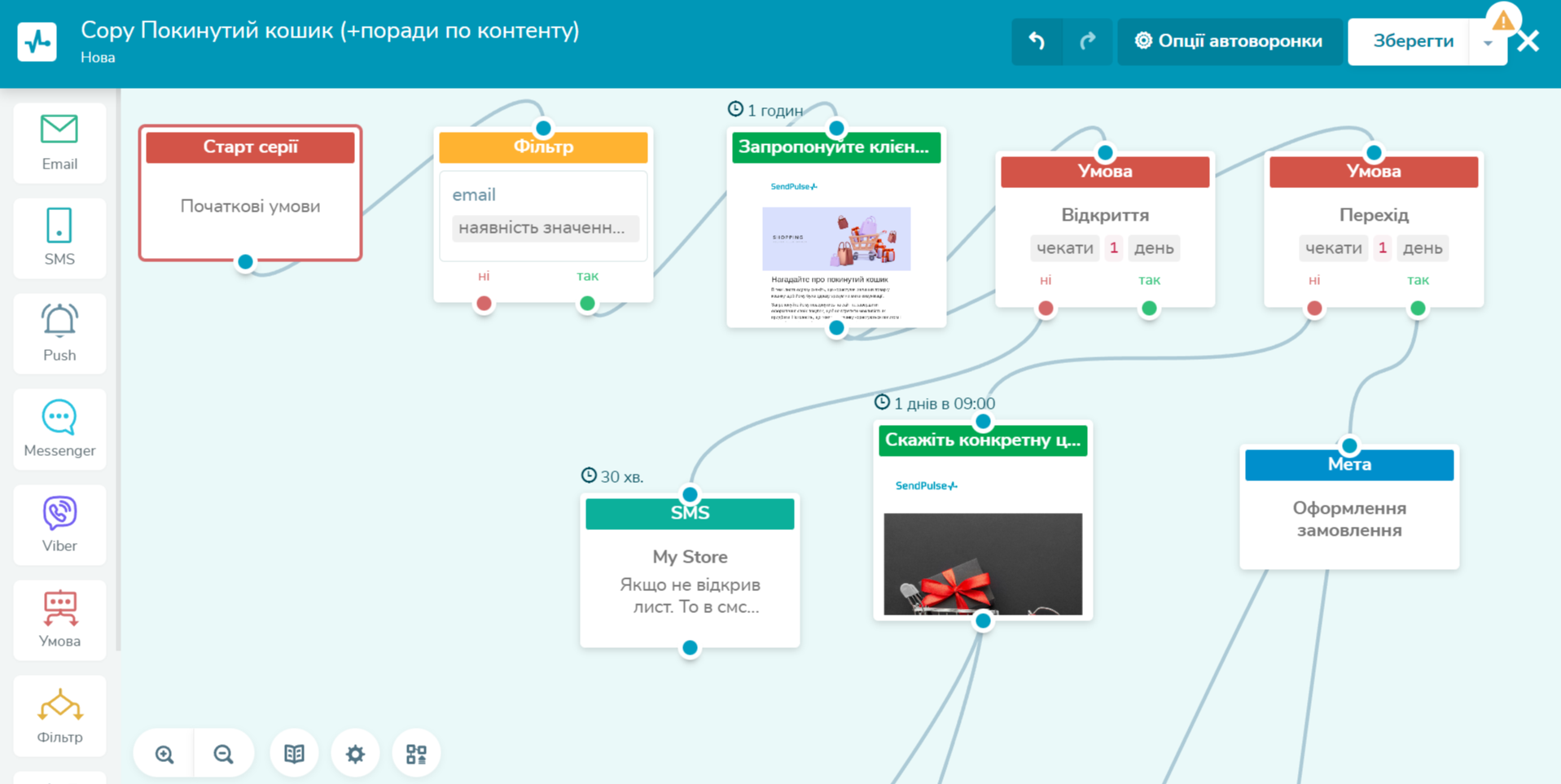 Більше того, ви можете додавати SMS та web push повідомлення та автоматизовані ланцюжки листів. Наприклад, SMS часто використовують для підтвердження замовлення, зміни пароля, або нагадування про майбутній івент.