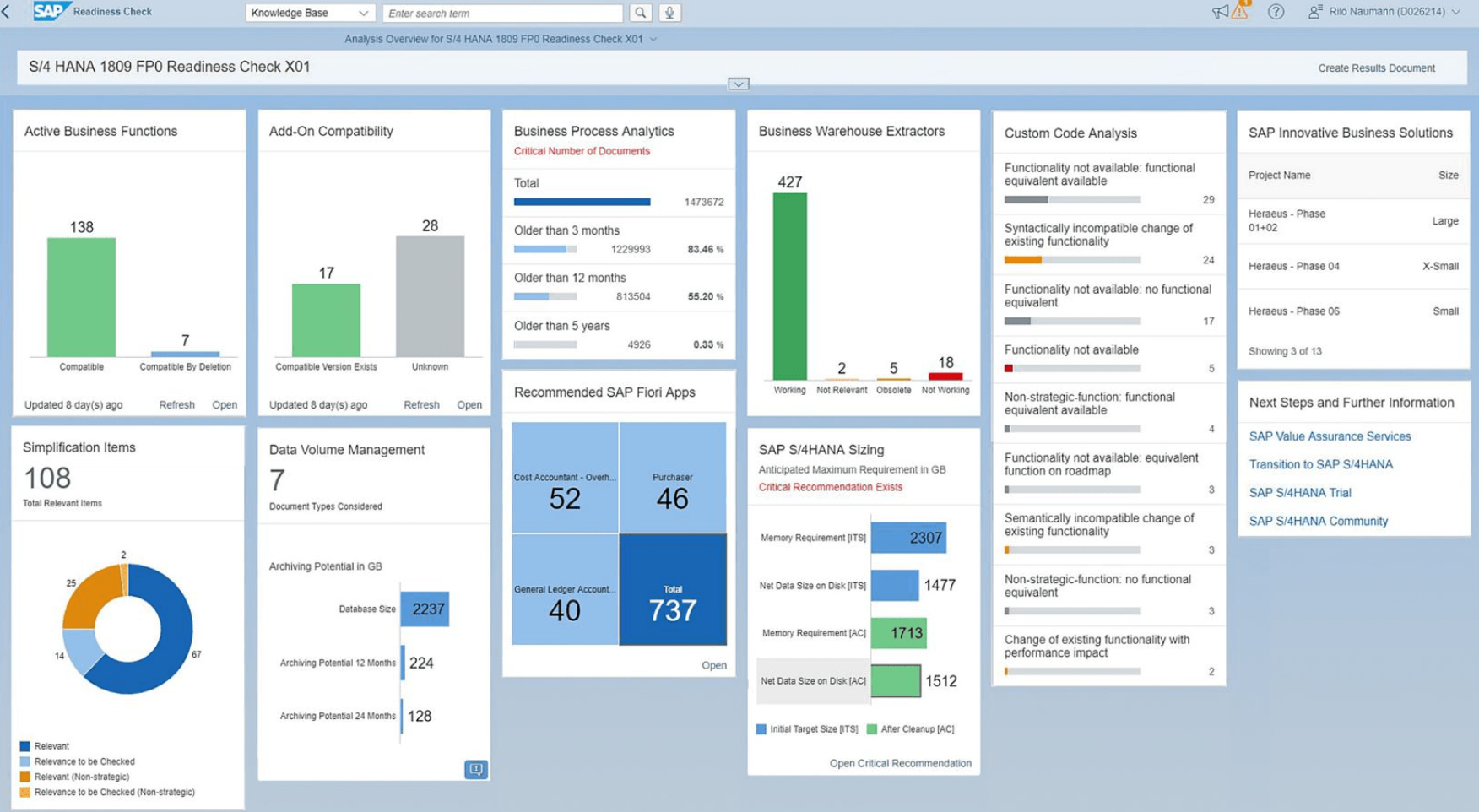 За структурою це дуже масштабні системи з функціями, що потребують індивідуального налаштування. Наприклад, нижче ви можете побачити скріншот із SAP S/4HANA Readiness Check — це частина SAP, яка допомагає проаналізувати, наскільки ваш бізнес готовий до переходу на цю систему.