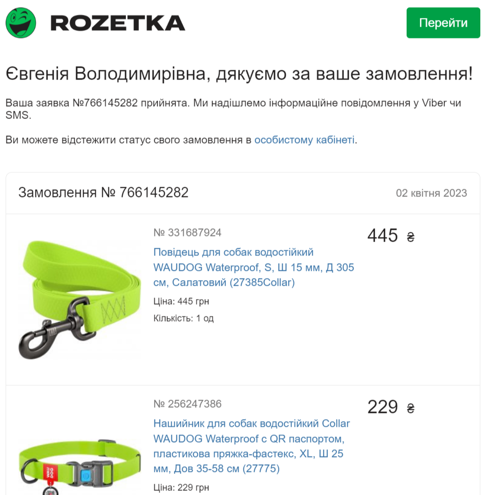 Ось приклад листа-підтвердження, яке користувачі отримують одразу після здійснення покупки. Дані про покупку підтягуються в лист за допомогою змінних. До того ж, покупець може переглянути персоналізовані рекомендації, які містяться в кінці листа.
