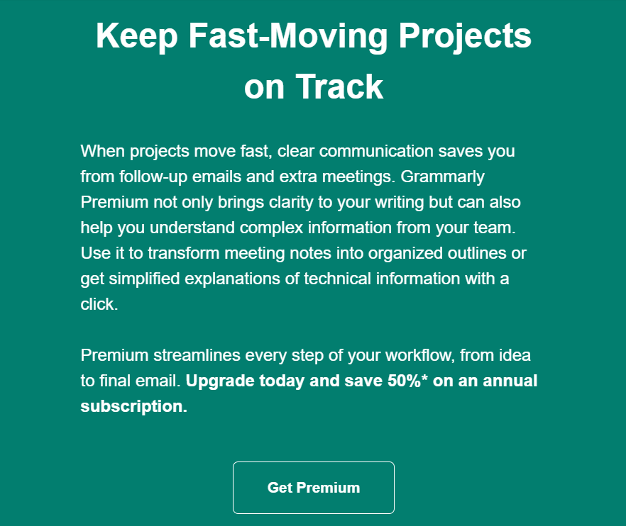 Нижче ви можете побачити, як Grammarly використовує email кампанії для перетворення підписників на платних клієнтів та заохочення їх до придбання преміум-підписки. Сервіс розкриває всі переваги та надає чітку кнопку заклику до дії, щоб користувачі могли придбати продукт.