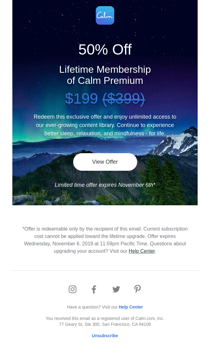 Подивімося на приклад Calm — мобільного додатку для сну та медитації. Компанія запропонувала своїм користувачам спокусливу пропозицію — придбати довічне членство за половину ціни. Щоб зробити її ще привабливішою, Calm додав два психологічні трюки. Сервіс підкреслив ексклюзивність цієї пропозиції прямо перед кнопкою заклику до дії, а також акцентував на рідкості цієї пропозиції одразу після неї.