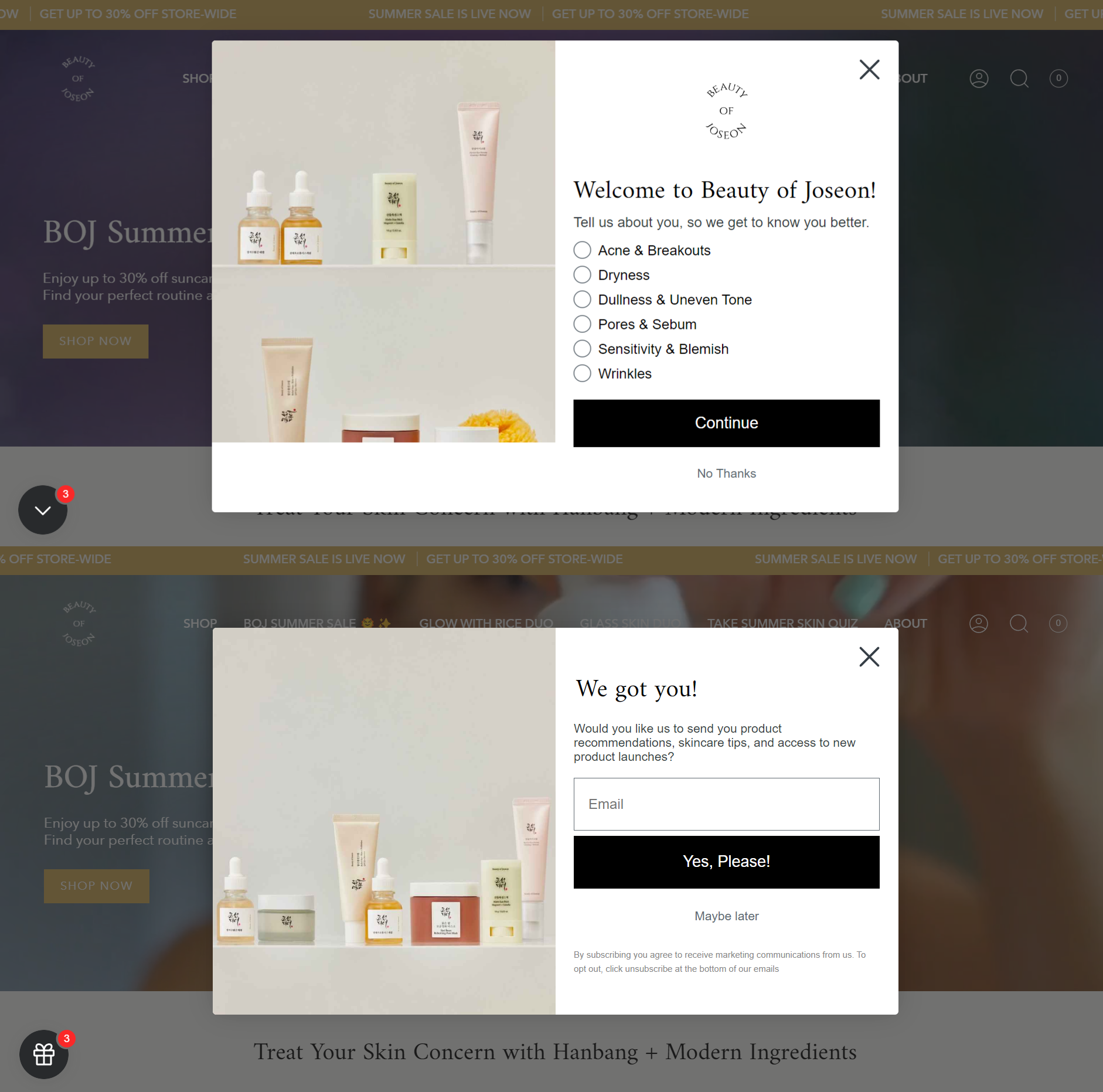 Нижче ви можете побачити, як Beauty of Joseon використовує цю стратегію на свою користь. Після переходу на сайт бренду користувач бачить спливаючу форму, яка пропонує йому поділитися інформацією про свої проблеми зі шкірою. Далі йому пропонується ввести адресу електронної пошти, щоб отримувати персоналізовані рекомендації щодо продуктів. Такий підхід дозволяє компанії збирати контактну інформацію та надсилати цільові пропозиції, що сприяє вищим коефіцієнтам конверсії.