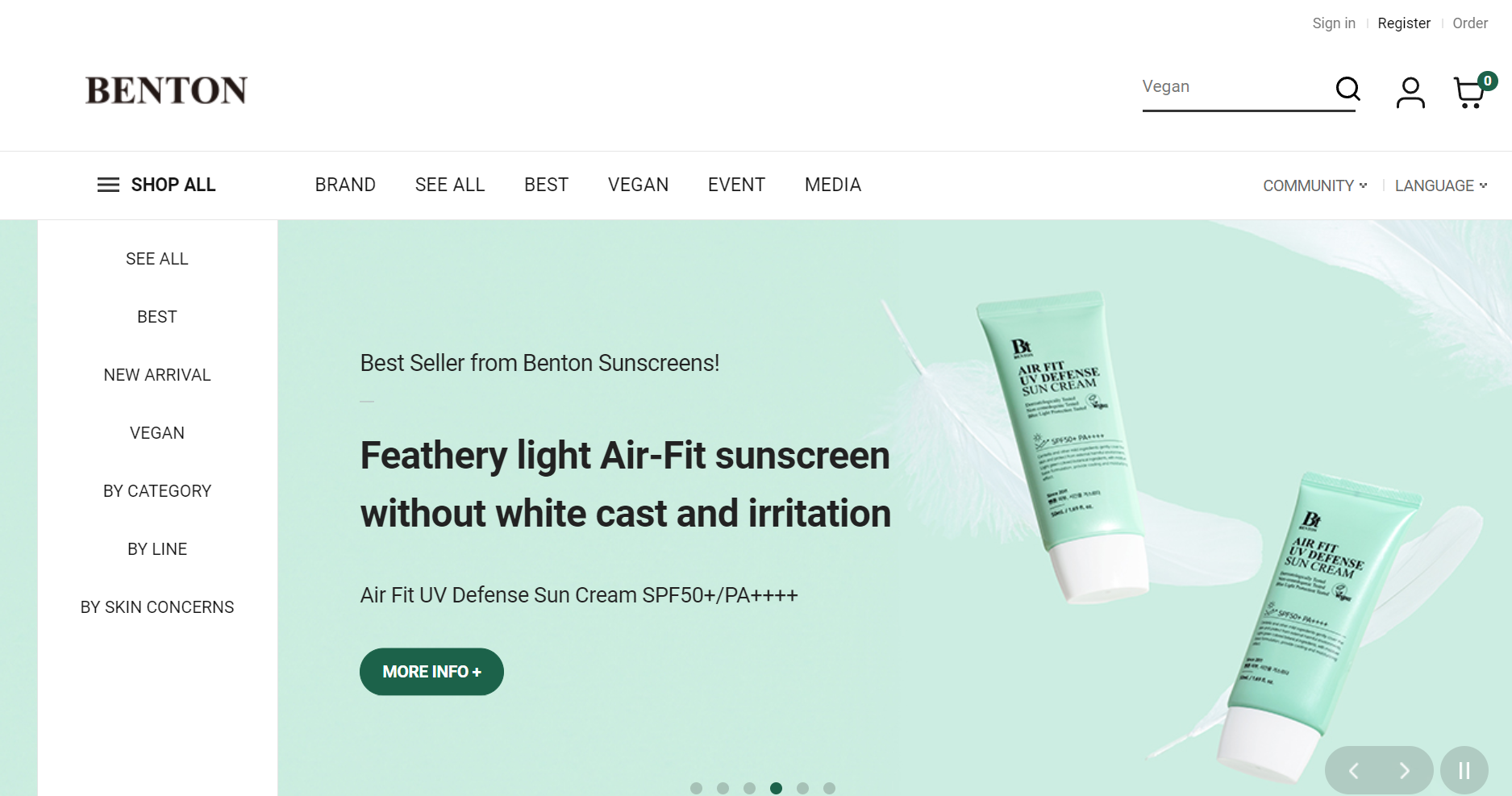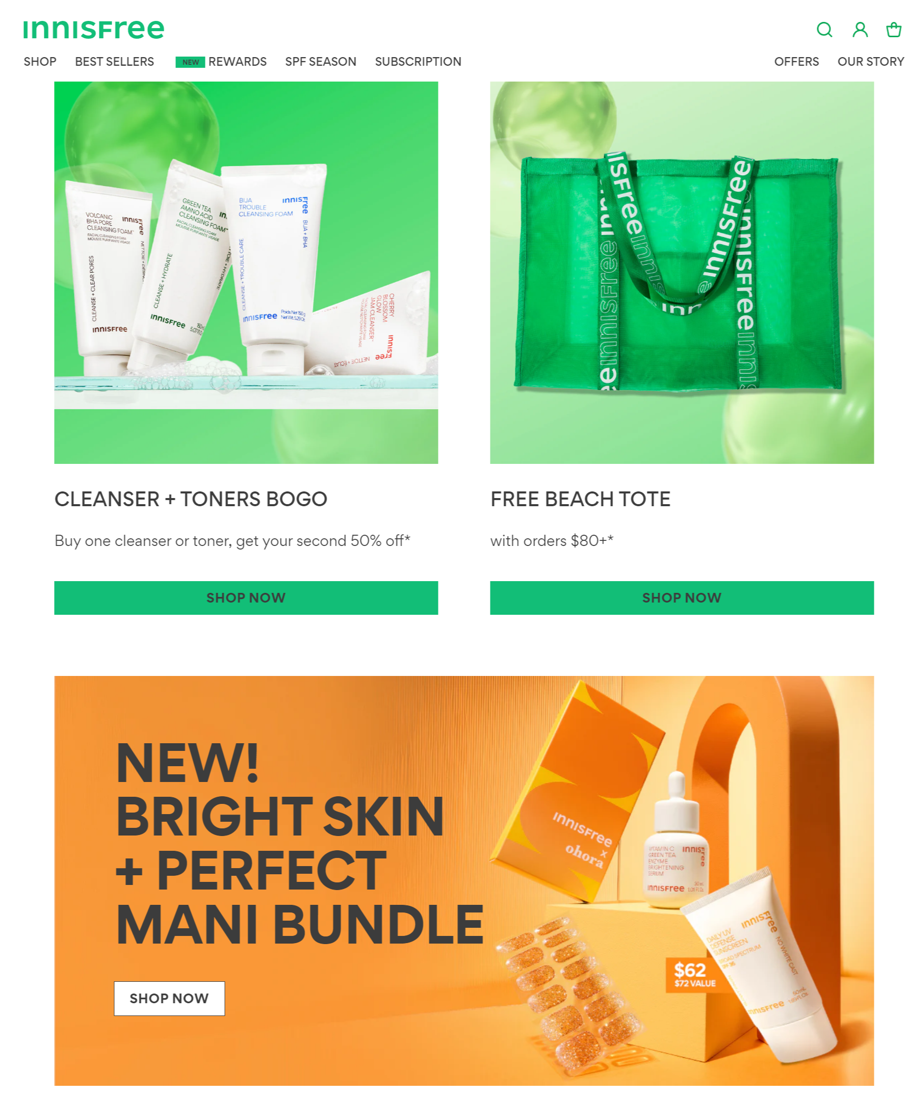Нижче ви можете побачити, як Innisfree, відомий корейський бренд засобів догляду за шкірою, ефективно використовує видимі, лаконічні та заохочувальні заклики до дії. Ці кнопки допомагають відвідувачам сайту перейти до важливих розділів та виконати бажані дії. Дизайн простий, з відповідно підібраними кольорами, що підвищує зручність використання.