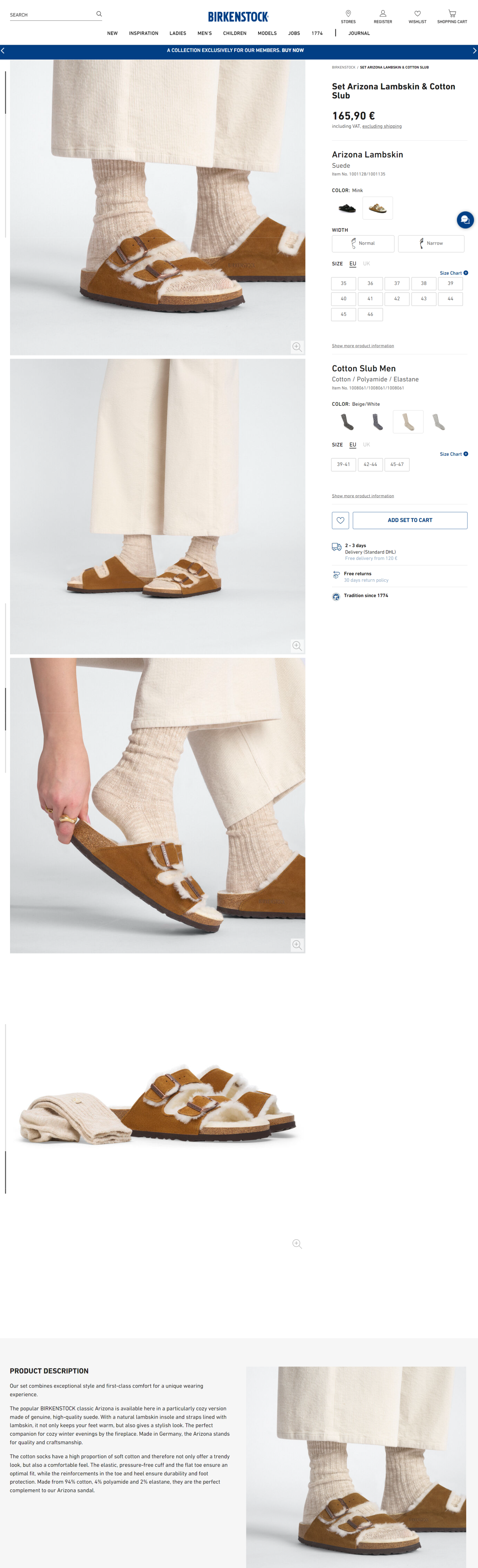 Нижче ви можете побачити, як Birkenstock описує свою продукцію. Кожен товар має чіткий опис, який надає детальну інформацію про продукт. Клієнти можуть миттєво побачити доступні розміри, ціни, матеріали тощо.
