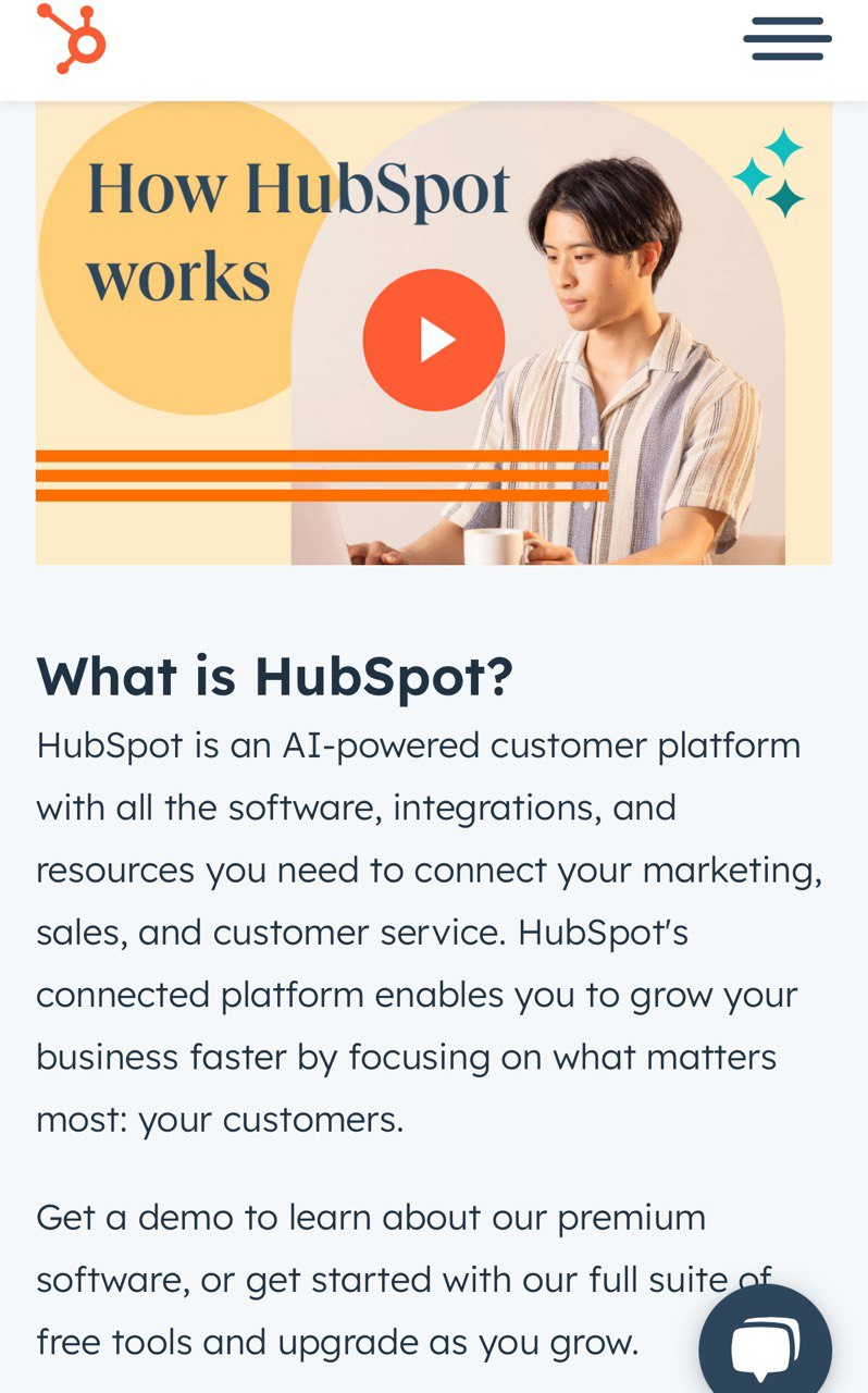 Наприклад, мобільна версія сайту HubSpot проста у навігації, має достатньо білого простору, інтуїтивно зрозумілі заклики до дії та інші зручні елементи.