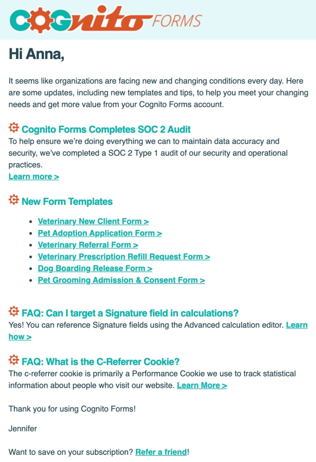 Персоналізація подобається 90% клієнтів. Починати спілкування зі звернення до одержувача на ім'я – це добре, як це робить Cognito Forms у прикладі нижче. Більше того, компанія використовує ім'я людини в рядку відправника, оскільки такі кампанії мають на 15-35% вищий коефіцієнт відкриття, ніж неперсоналізовані повідомлення від компаній.