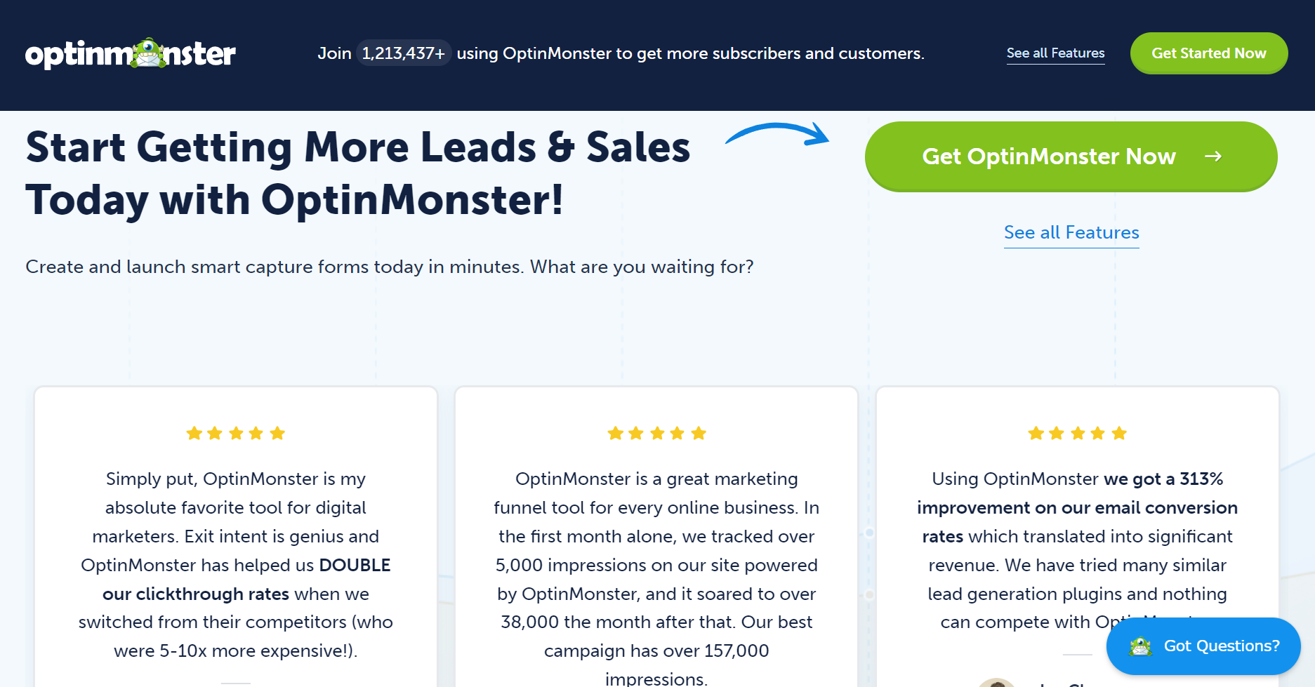 Нижче ви можете побачити, що OptinMonster додає відгуки клієнтів на свій сайт. У цих відгуках обговорюються переваги використання сервісу та те, як він допомагає вирішувати конкретні проблеми.