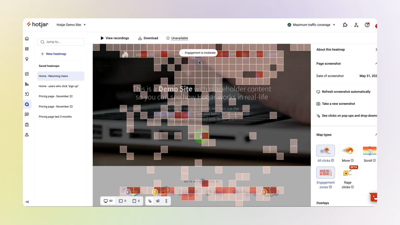 За допомогою платформи ви можете створювати теплові карти, які візуалізують поведінку користувачів. Вони покажуть, як користувачі переміщуються по сайту, клікають і прокручують сторінки, що дозволить усунути труднощі та збільшити кількість конверсій. Використання Hotjar дає змогу швидко з'ясувати, що викликає у користувачів розчарування і бажання залишити ваш сайт. Крім того, платформа допомагає аналізувати поведінку користувачів на різних пристроях, зокрема смартфонах, ноутбуках і планшетах. Це дозволяє знаходити місця для оптимізації та забезпечувати відмінний досвід на всіх пристроях.