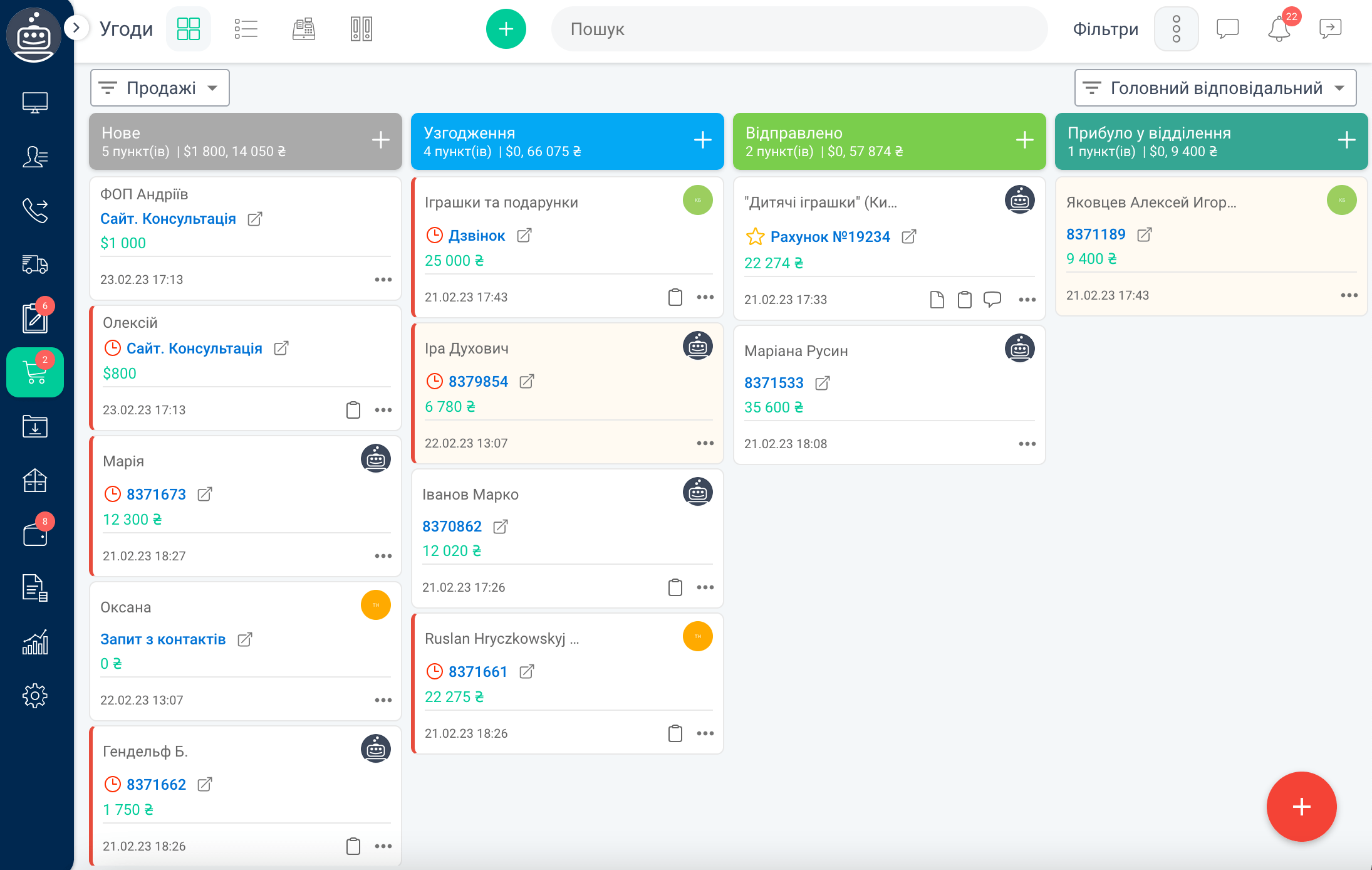 У нашій CRM ви можете зберігати та оновлювати інформацію про клієнтів, створювати угоди, додавати потрібні вам статуси, щоб візуалізувати процеси на канбан-дошці.
