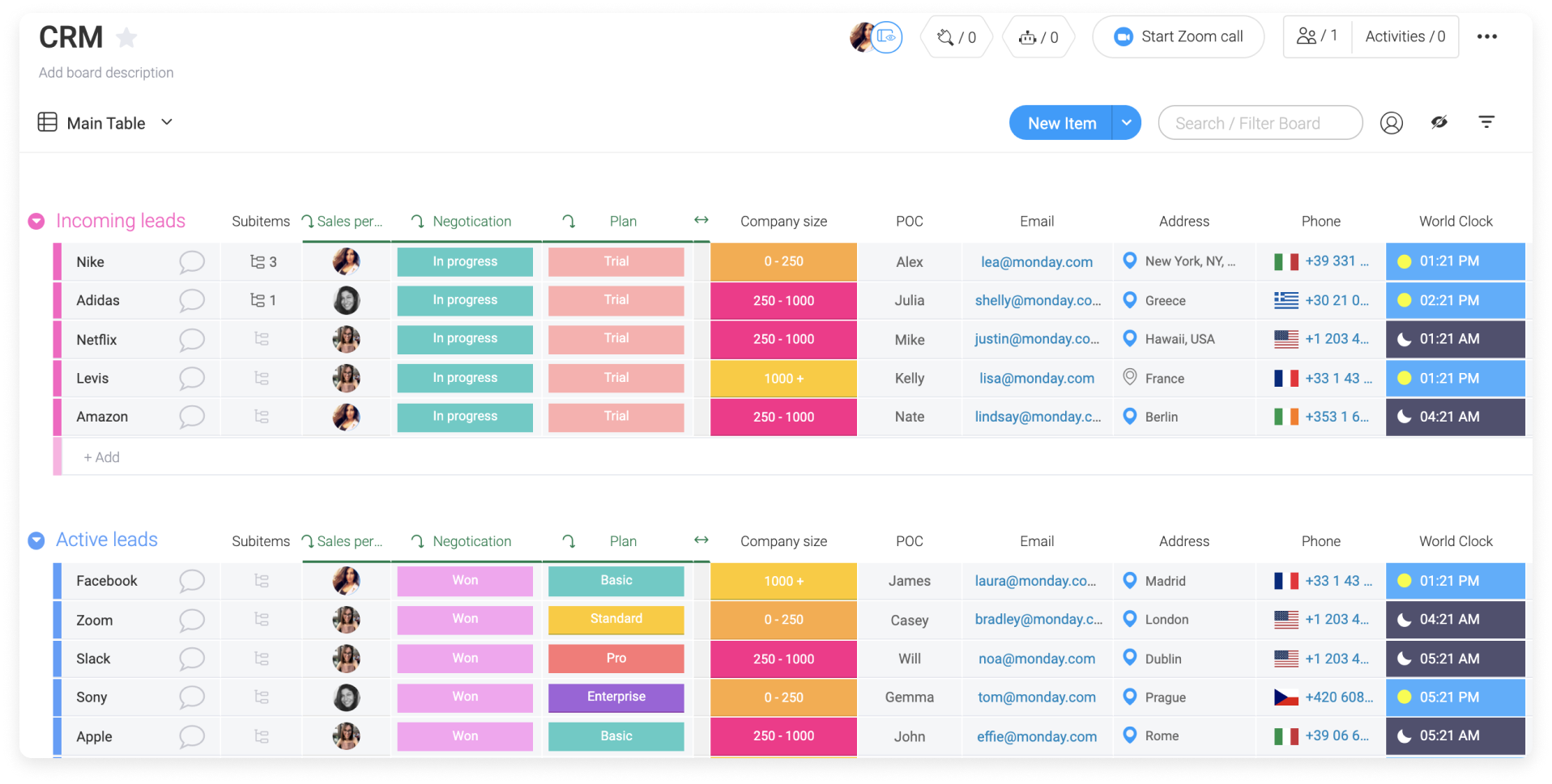 CRM від monday.com пропонує користувачам спробувати його безкоштовний тарифі функції. Він охоплює два користувача, необмежену кількість документів і понад 200 шаблонів. Але якщо вам потрібен доступ до таких функцій, як керування контактами, візуальні канали продажів, мобільна CRM, користувацькі поля та необмежена кількість контактів, радимо придбати платний тариф, який починається від €10 за користувача на місяць.
