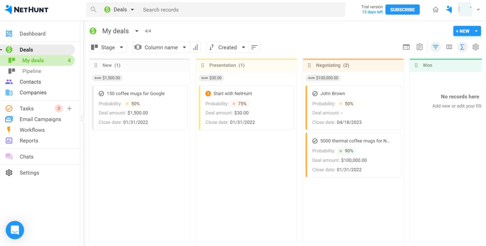 Інтуїтивно зрозумілий інтерфейс допомагає візуалізувати ваші продажі та відстежувати потенційних клієнтів. Якщо у вас є досвід роботи з платформами, заснованими на канбан-дошці, тоді вам буде легко налаштувати та використовувати CRM. Ви можете коригувати інформаційну панель відповідно до своїх уподобань і потреб.