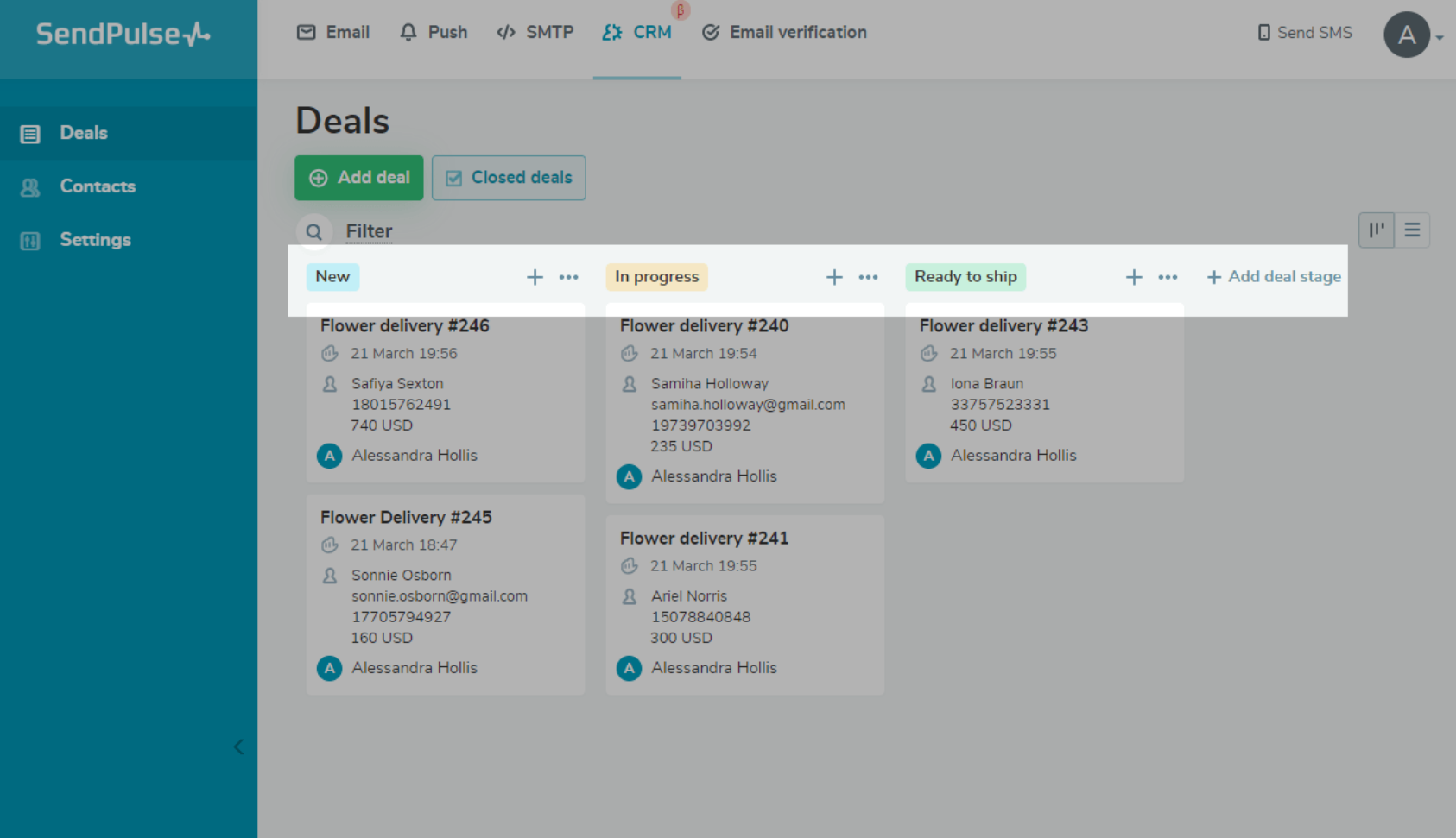 CRM від SendPulse є абсолютно безкоштовною. Ви можете вільно зберігати всю інформацію, створювати ефективну воронку продажу, щоб працювати з клієнтами за певним сценарієм, користуватися різними каналами для спілкування та закривати угоди.