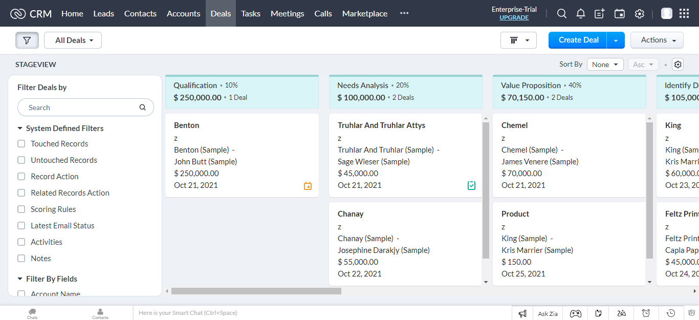 Програмне забезпечення Zoho надає користувачам багатоканальний зв’язок. Це дозволяє вам автоматизувати процес зв’язку з клієнтами за допомогою телефону, електронної пошти, чату та соціальних мереж. Якщо клієнти зв’яжуться з вашою компанією, ви одразу будете сповіщені. В результаті ви отримаєте звіт про ефективність комунікації з потенційними клієнтами та покупцями. За допомогою розмовного помічника ви можете швидко знайти необхідну інформацію у своїй CRM і отримати прогнози щодо угод з певними клієнтами. Таким чином ви зможете визначити потенційних клієнтів, які з більшою ймовірністю принесуть вам прибуток. Крім того, помічник буде нагадувати про завдання та вносити пропозиції.