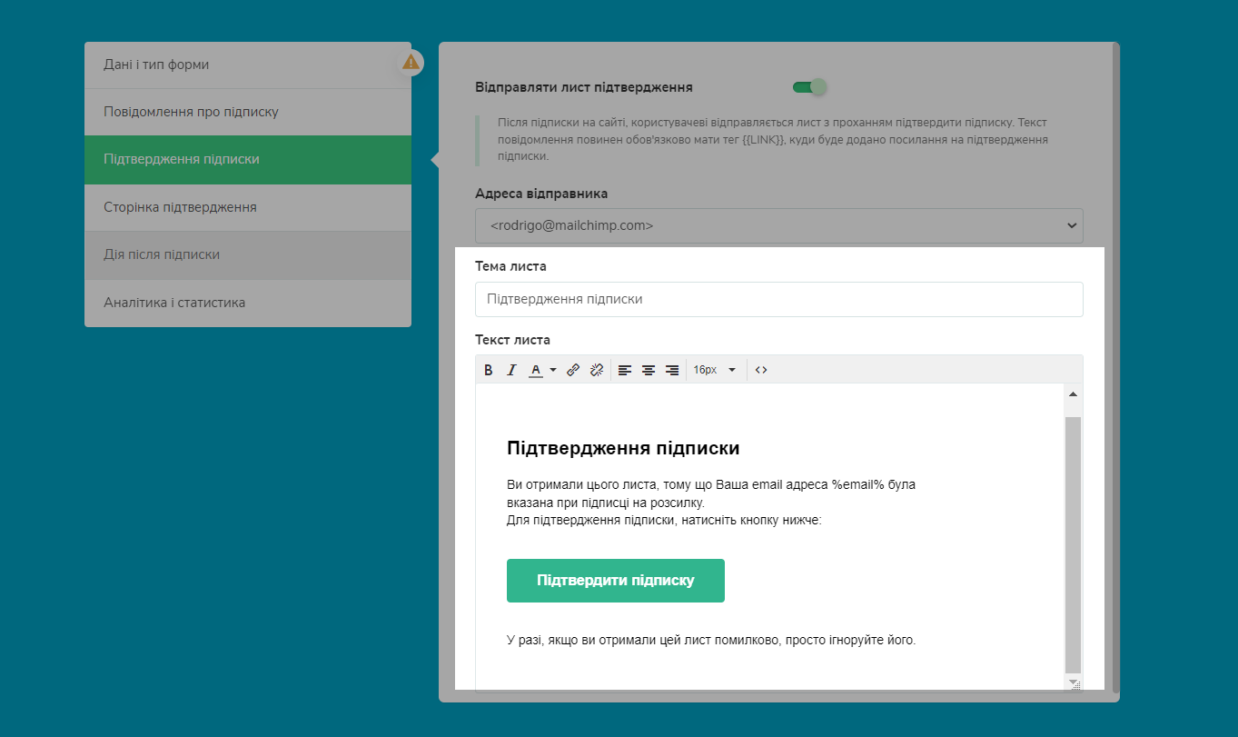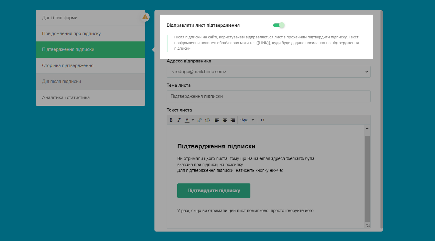 У верхньому правому куті натисніть Опції форми» та перейдіть до «Підтвердження підписки». Тут слід увімкнути відповідне налаштування, повернувши тумблер у положення ON. Отже, після підписки користувачі отримають підтвердження електронною поштою.