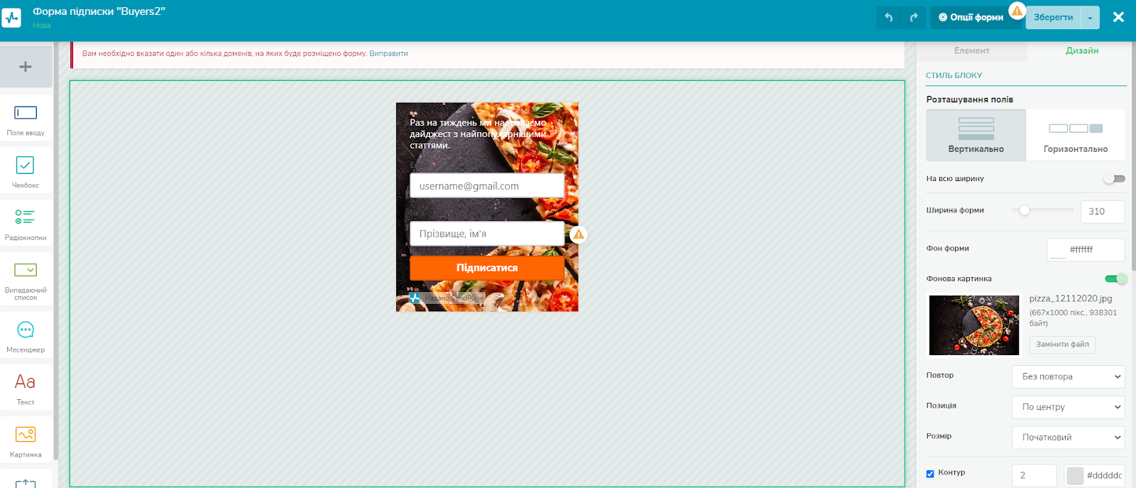 Перетягніть необхідні елементи зліва на вашу форму та відредагуйте їх на правій панелі. Ви можете додати скільки завгодно полів, використовувати чекбокси, радіокнопки, випадаючі списки тощо. Змінюйте стиль, кольори, шрифт, зображення, колір фону тощо.