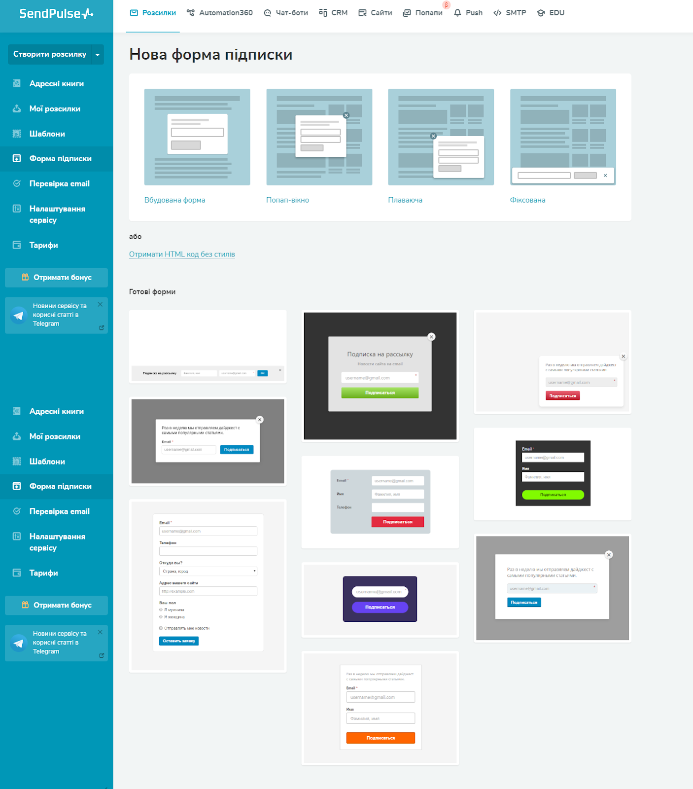 SendPulse дозволяє маркетологам безкоштовно створювати форми без будь-яких технічних навичок. Ви можете створити одноетапну або двоетапну форму в нашому сервісі. Дотримуйтеся наведених нижче інструкцій.