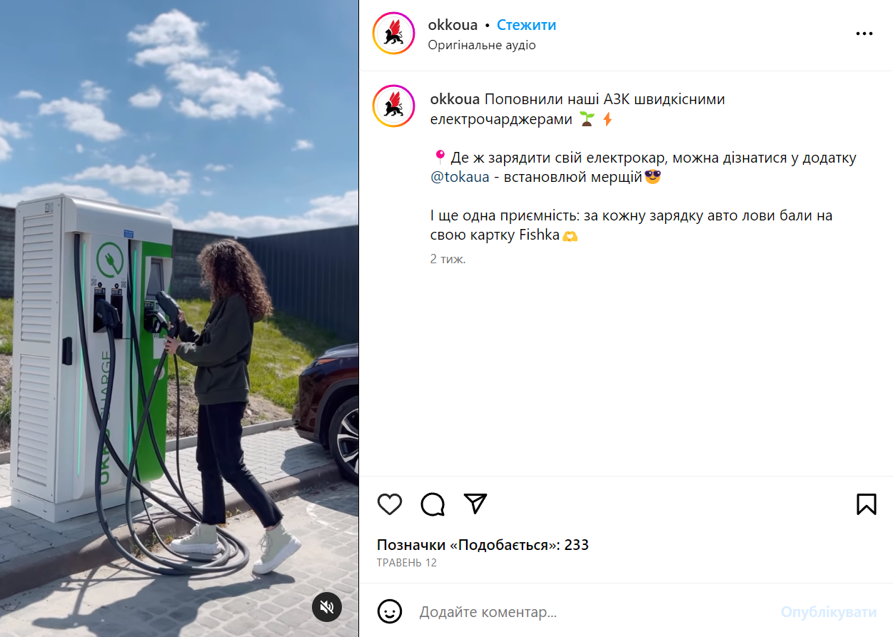 Нижче ви можете побачити приклад того, як компанія ОККО повідомляє потенційних клієнтів про наявність швидкісних електрочарджерів на їх заправках.