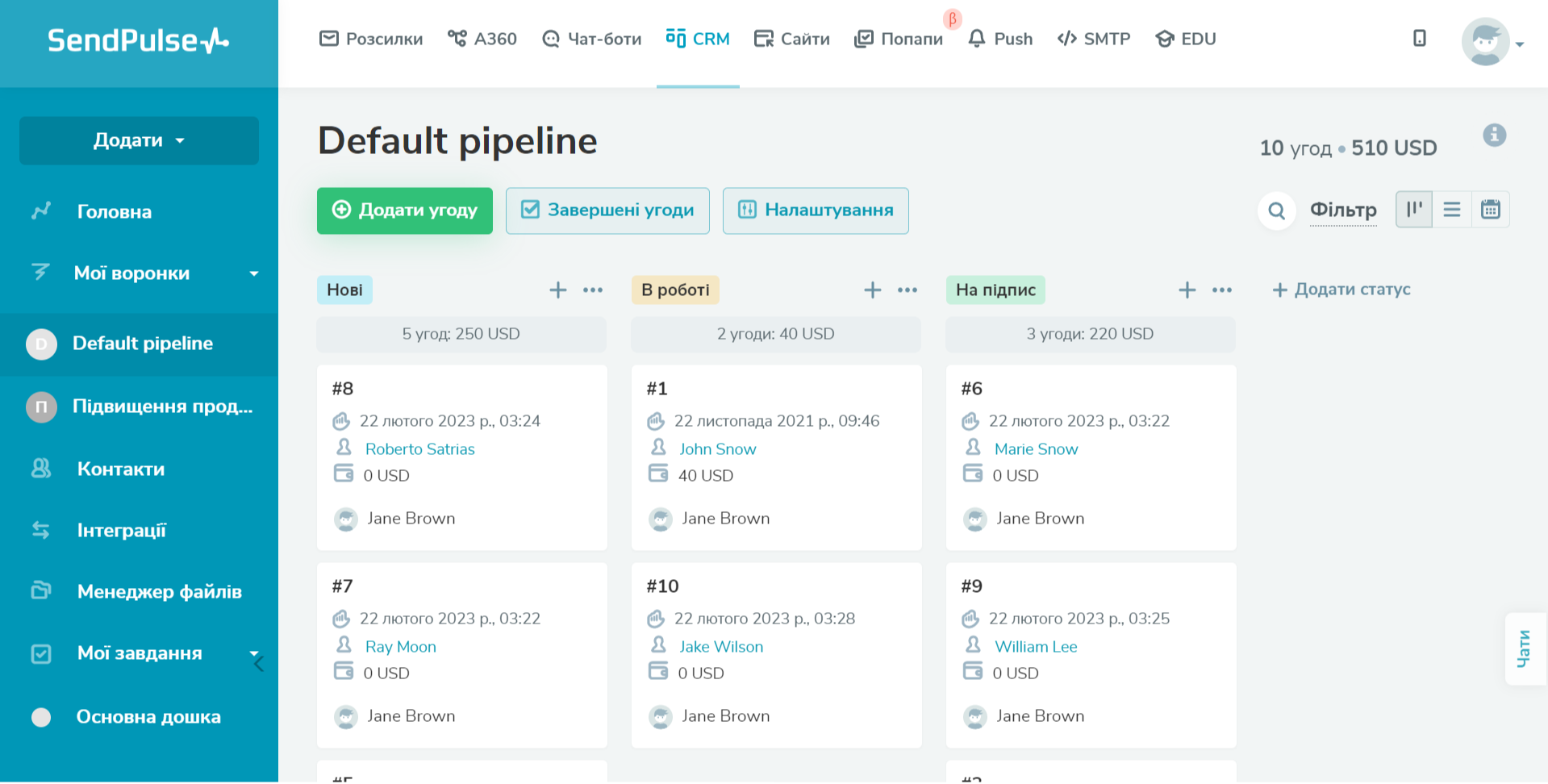 Нижче ви можете побачити, як безкоштовно створювати угоди у CRM від SendPulse.