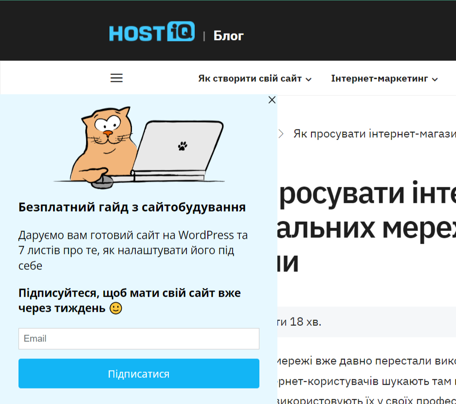 Наприклад, український хостинг HOSTIQ пропонує відвідувачам сайту безплатний гайд із сайтобудування в обмін на їхню email адресу через форму підписки.