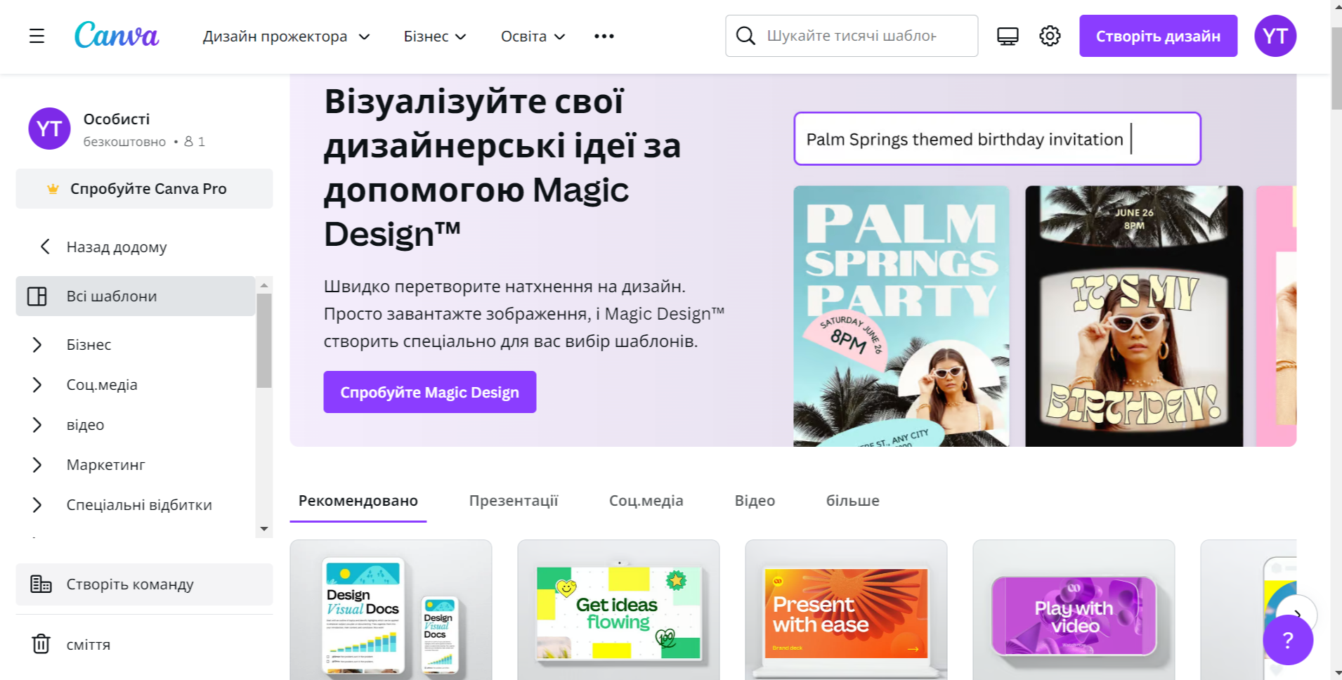 У прикладі нижче ви можете побачити, що Canva пропонує шаблони для презентацій, соціальних мереж та розвитку бренду.