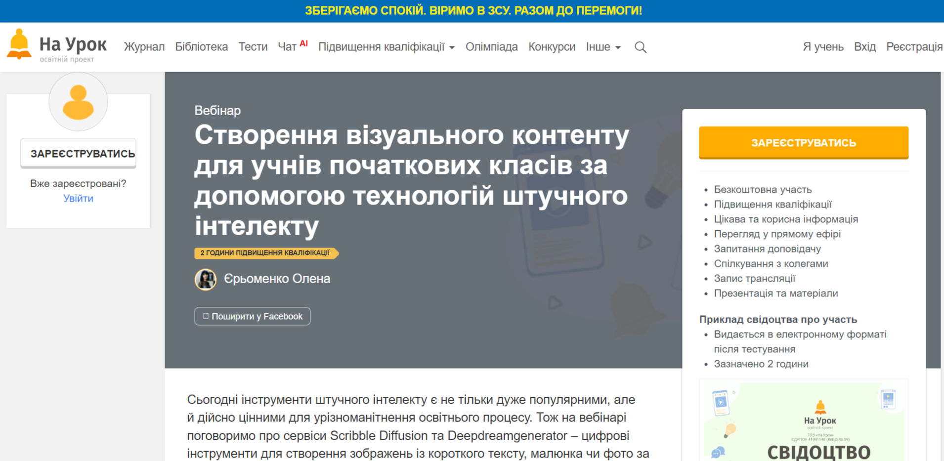 Нижче можете побачити приклад вебінару для підвищення кваліфікації вчителів від освітнього проекту «На урок».