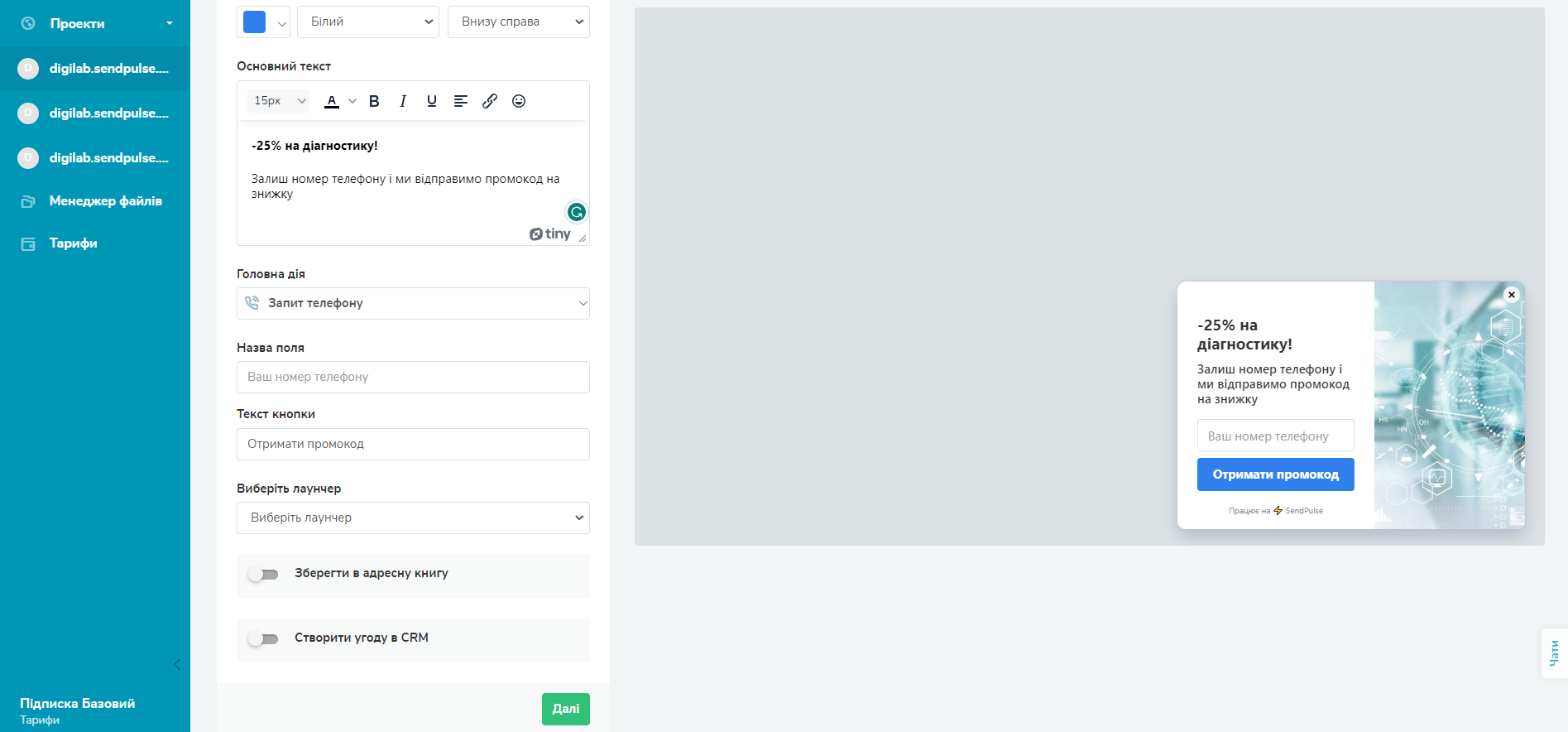 - Збережіть на опублікуйте ваш попап. Перед публікацією ви побачите, як виглядає ваша форма. Після публікації ви зможете відслідковувати статистику та редагувати налаштування попапу.