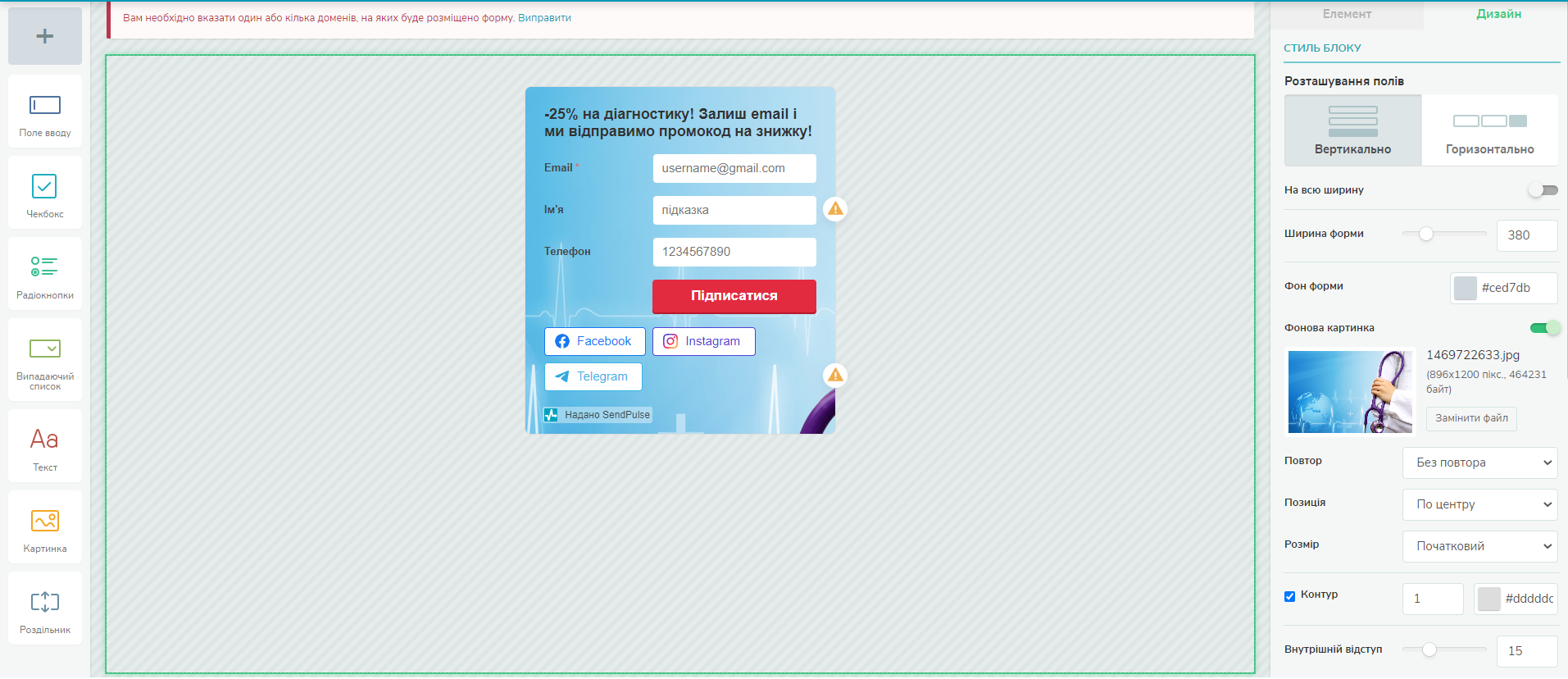 Ось так виглядає процес створення форми в SendPulse. Вам потрібно перетягувати потрібні елементи на робоче поле і редагувати їх дизайн.