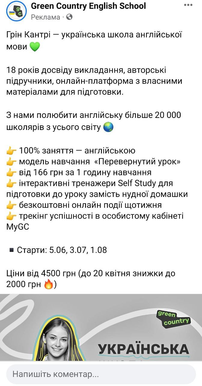 Нижче ви можете побачити приклад реклами з школи з вивчення англійської мови в Facebook.