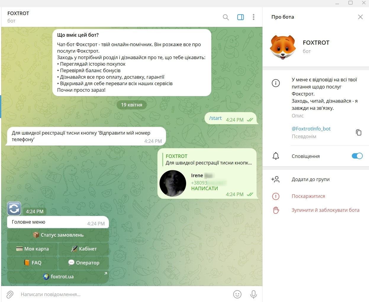 За допомогою чат-бота у Telegram від Foxtrot користувачі можуть відслідковувати статус своїх замовлень, перевіряти баланс на бонусній карті, отримати відповіді на поширені питання, потрапити у свій кабінет, або зв’язатися з оператором. Для цього потрібно авторизуватися за своїм номером телефону.