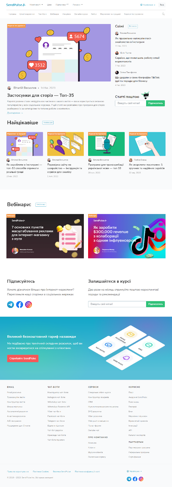 Ось блог SendPulse, в якому можна знайти багато корисних статей на тему маркетингу. Статті можна сортувати за темами, а залучають користувачів до них за допомогою email розсилок.