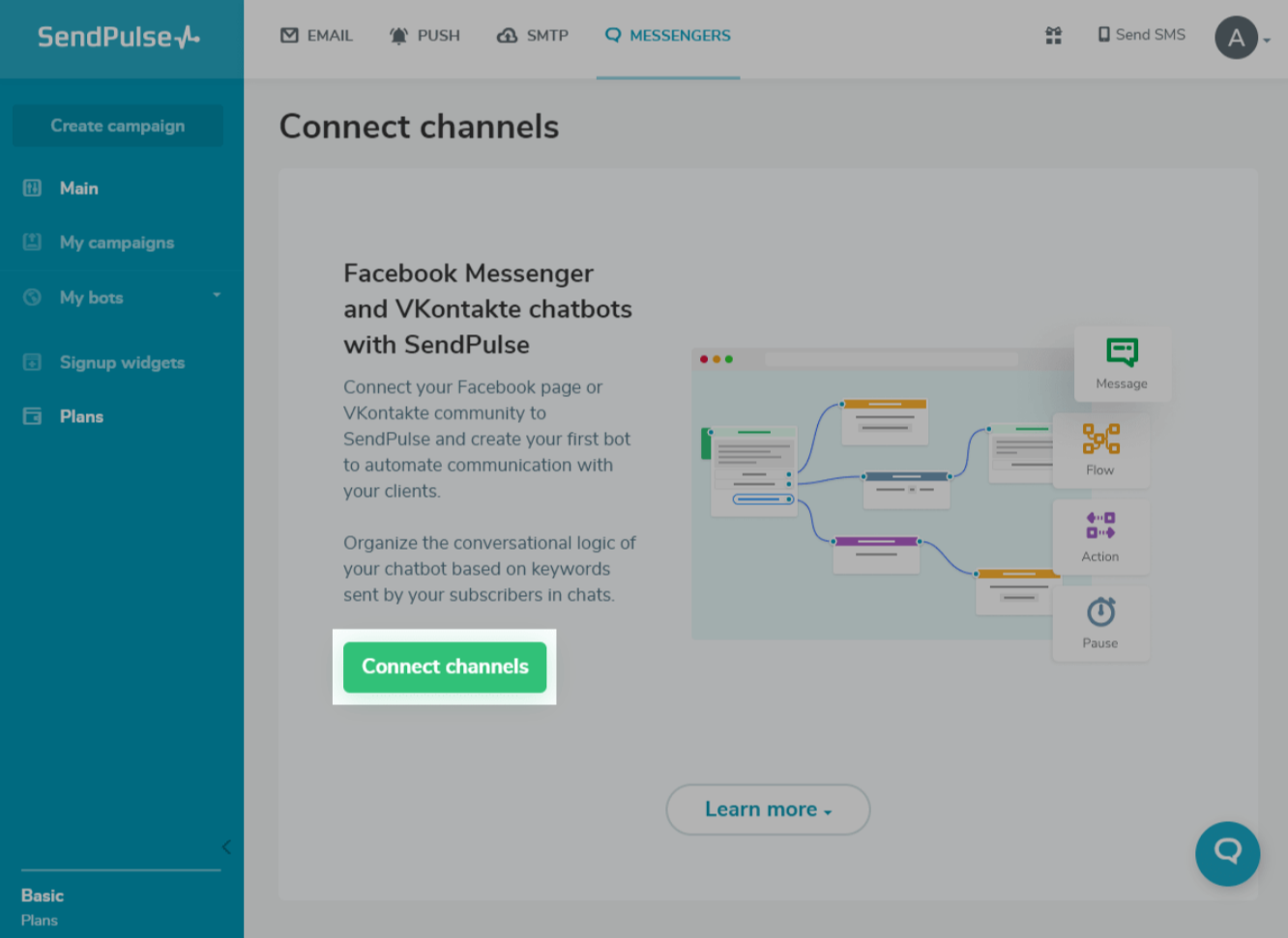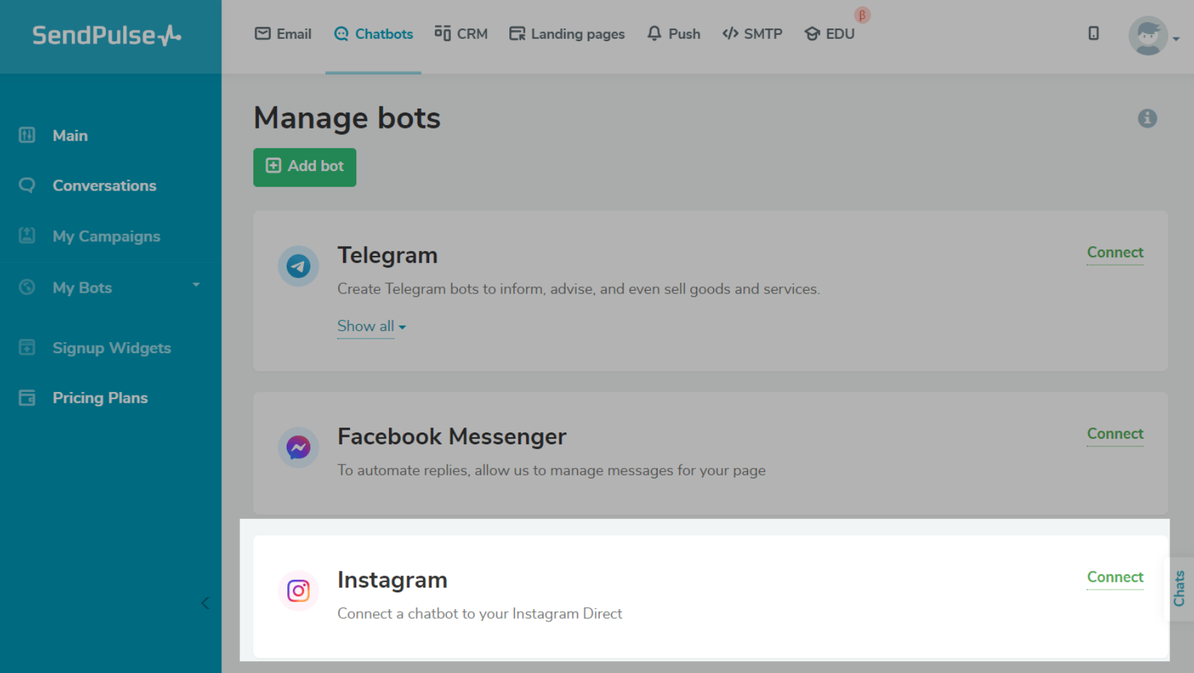 Перейдіть до розділу «Чат-боти» (Chatbots) у вашому обліковому записі в SendPulse і натисніть «Підключити канали» (Connect).