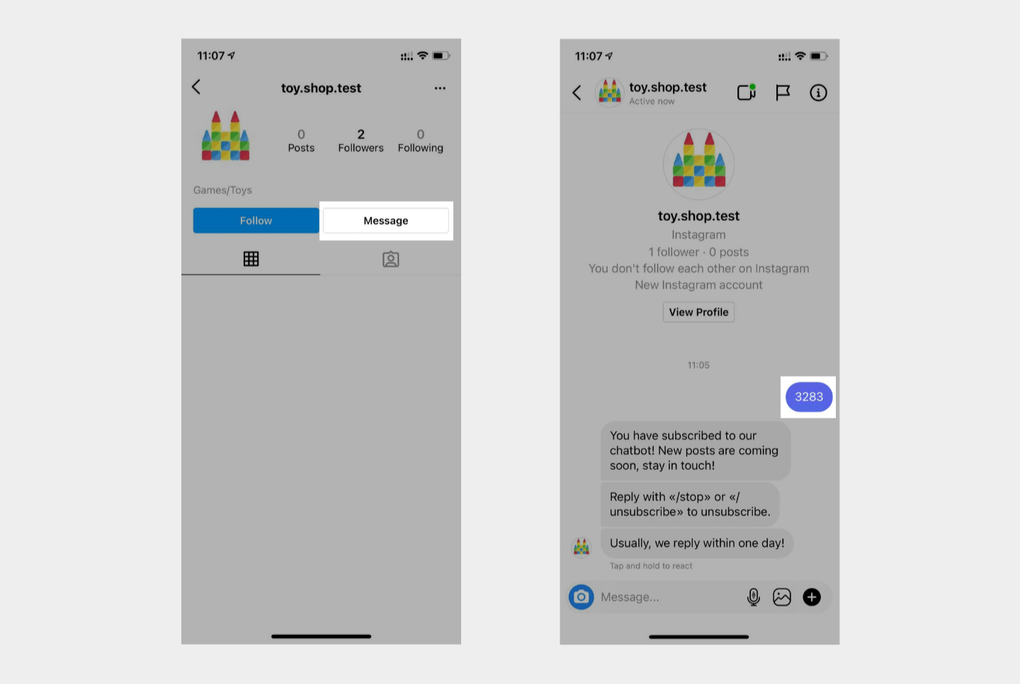 Щоб протестувати свій чат-бот, зробіть другий Instagram-акаунт (особистий) власником бота. Для цього залогіньтесь та відскануйте QR код або перейдіть за посиланням на ваш бізнес-акаунт в Instagram.