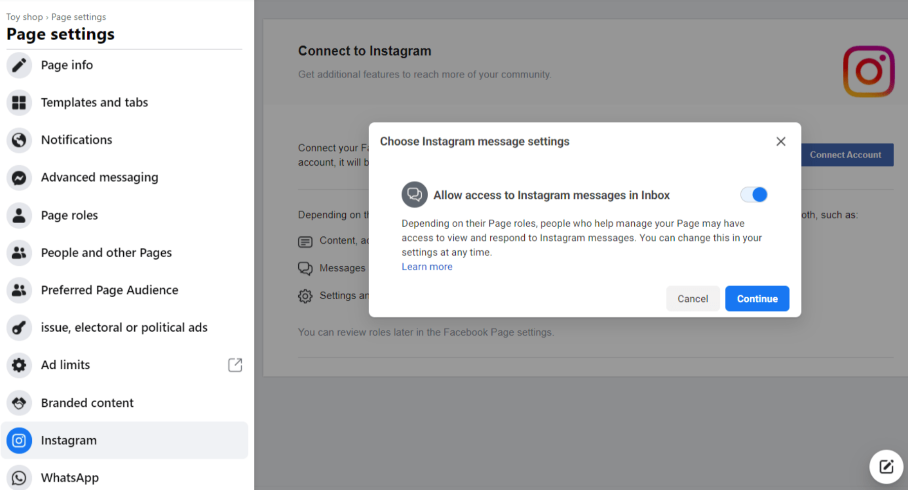 Спочатку вам потрібно зв'язати сторінку у Facebook з бізнес-акаунтом у Instagram. Зробити це можна трьома різними способами. Нижче ми покажемо, як це зробити, на прикладі одного з них. Усі три способи описані в нашій базі знань.